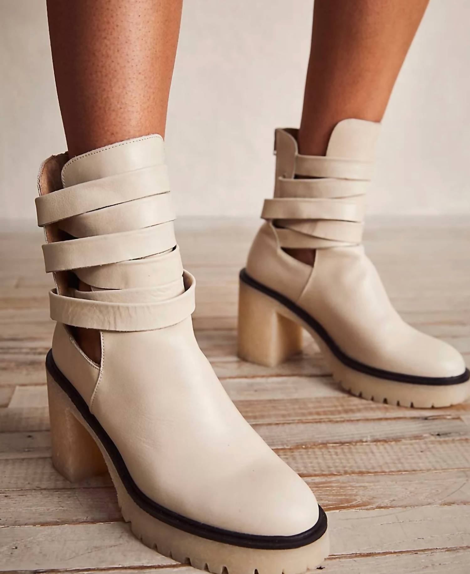 Ankle length. Smooth leather uppers. Strappy details. Cool cutouts. Rigged platform sole. Block heel. Zipper closure. Imported.