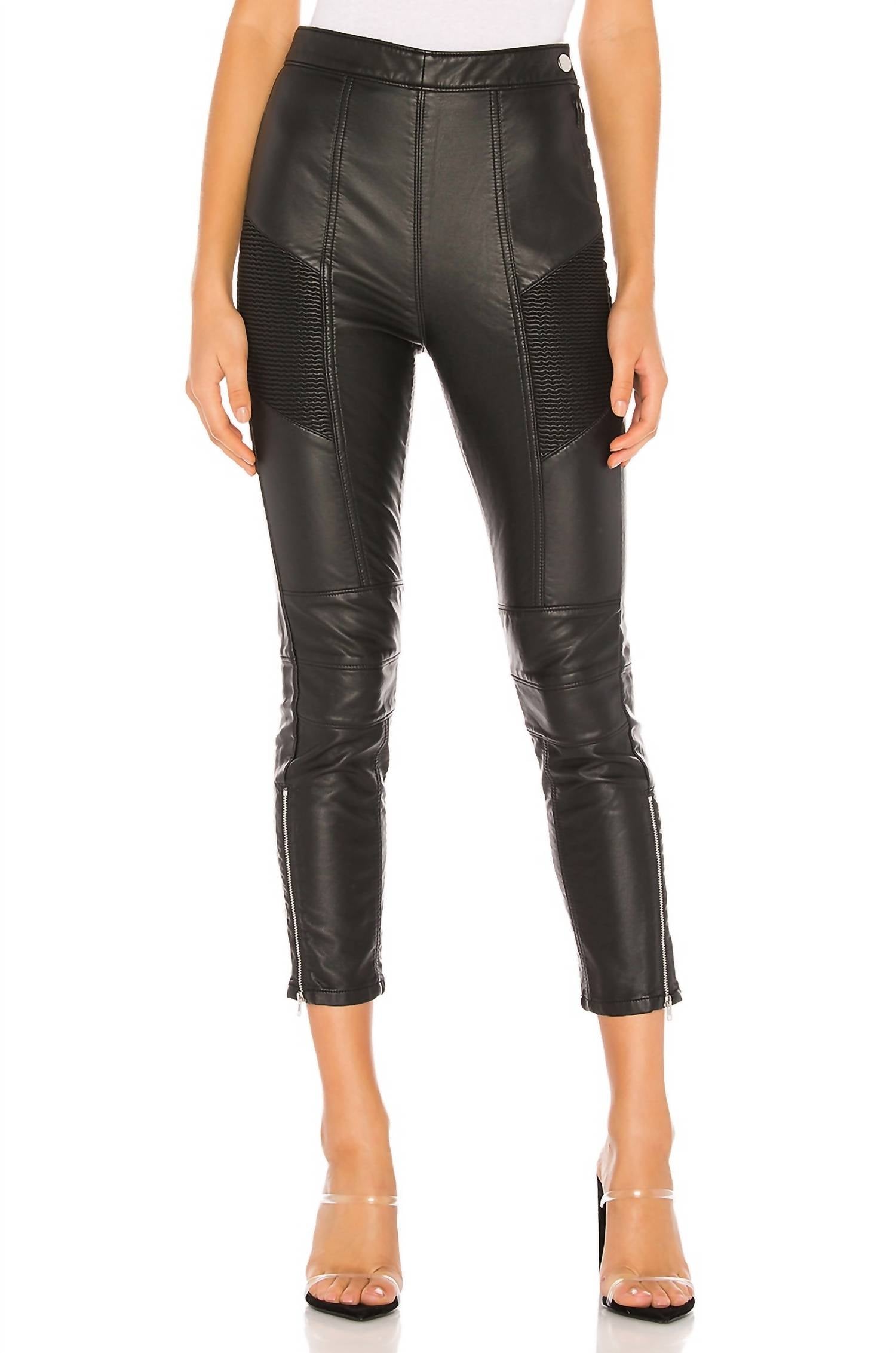 Introducing the Kaelin Moto Skinny Pants by Free People, where edgy style meets chic comfort. These skinny-leg pants boast a high-rise fit with a 25" inseam, a 11.5" rise, and are crafted from a durable polyester blend with a faux leather finish. The sleek black design features a concealed side zip and snap button closure for a seamless look. Designed with a 13" knee opening and a 9" leg opening, these pants offer a modern silhouette perfect for any occasion. Care recommendation: Spot or wipe clean.