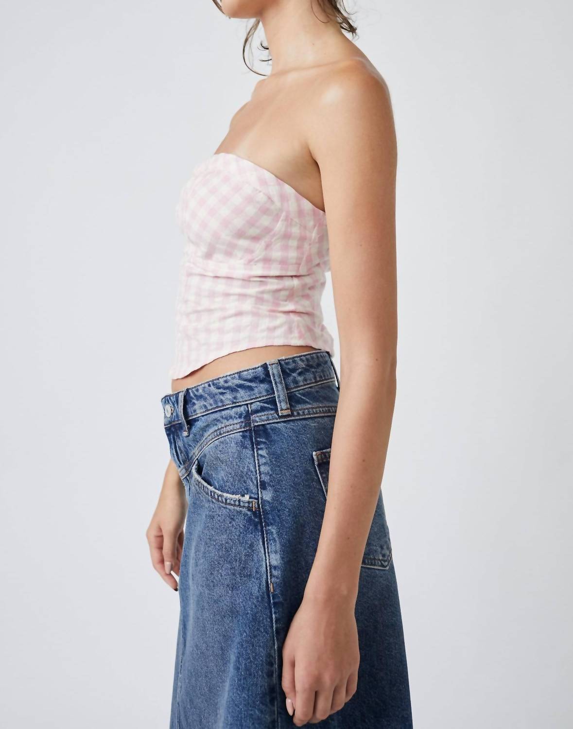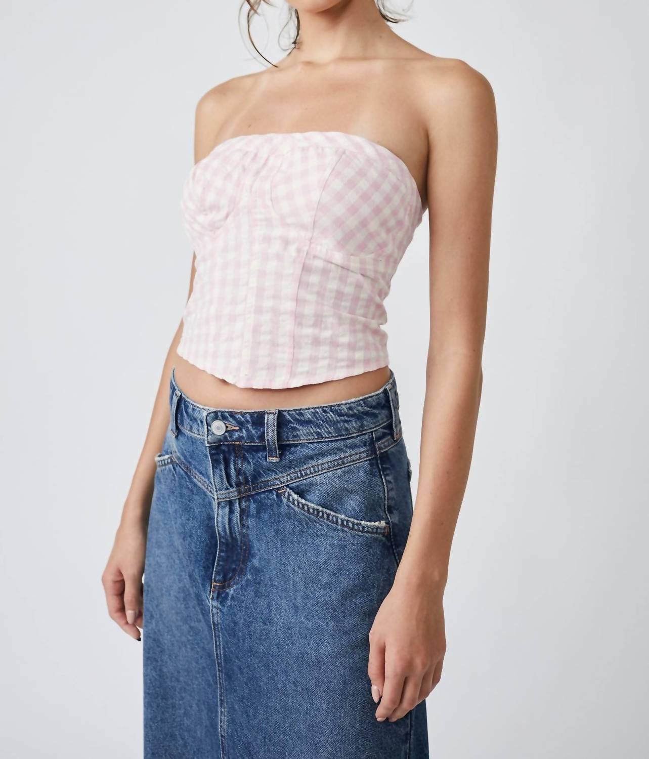 Strapless, cropped fit. Corset-inspired seaming, rounded bottom hem, smocking at back. Hand Wash Cold. Import. Bust: 34 in. Length: 12 in. 100% Cotton.