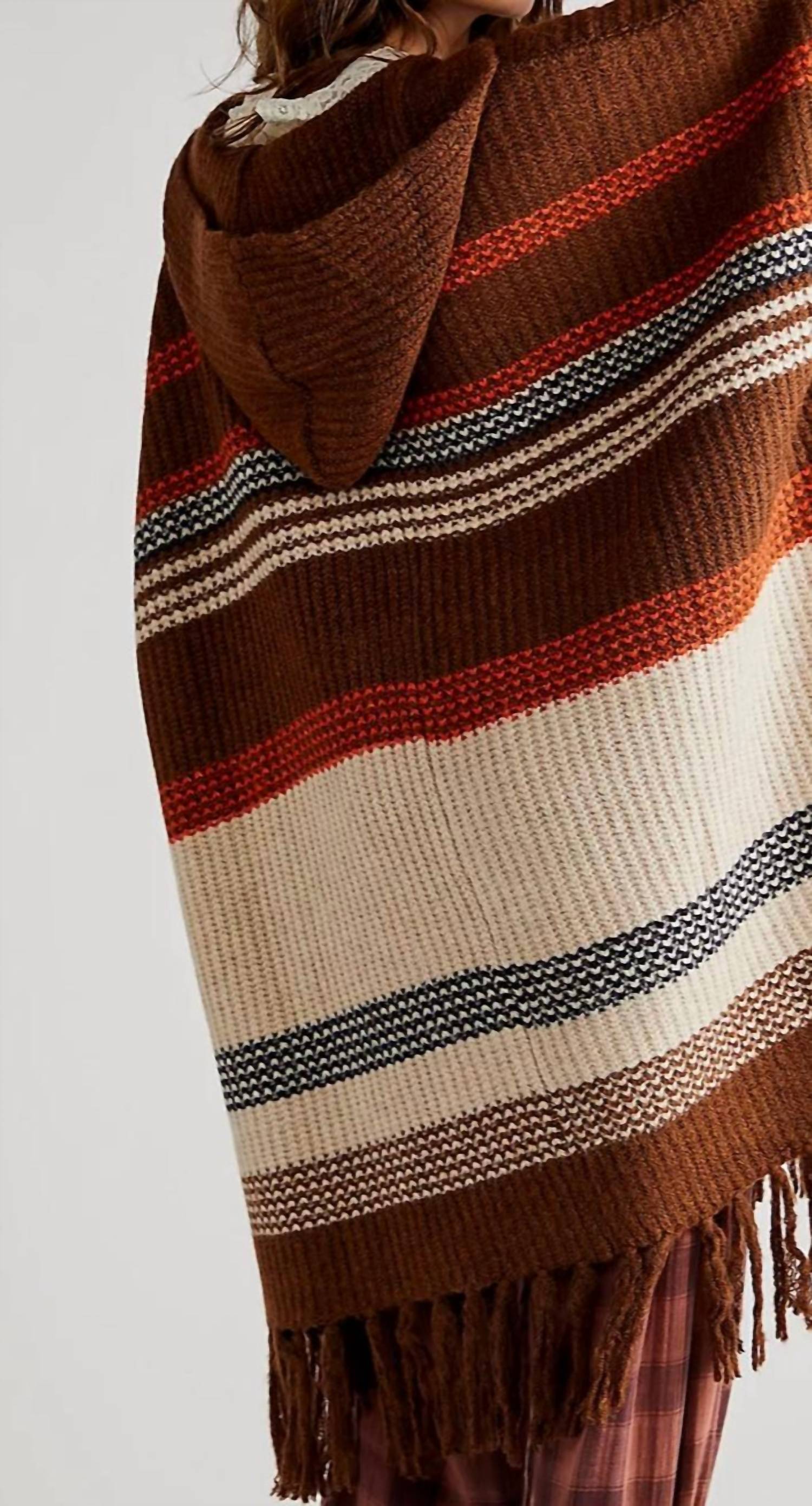 Cool and classic. Timeless poncho. Featured in perfect retro inspired knit fabrication and staple drapey. Short sleeve silhouette. Hood details. Fringe bottom trim. Oversized. Slouchy fit. Side slits. Boxy fit. V Neckline. Hand wash cold. Bust 76". Length 35". 80% Acrylic. 20% Polyester.