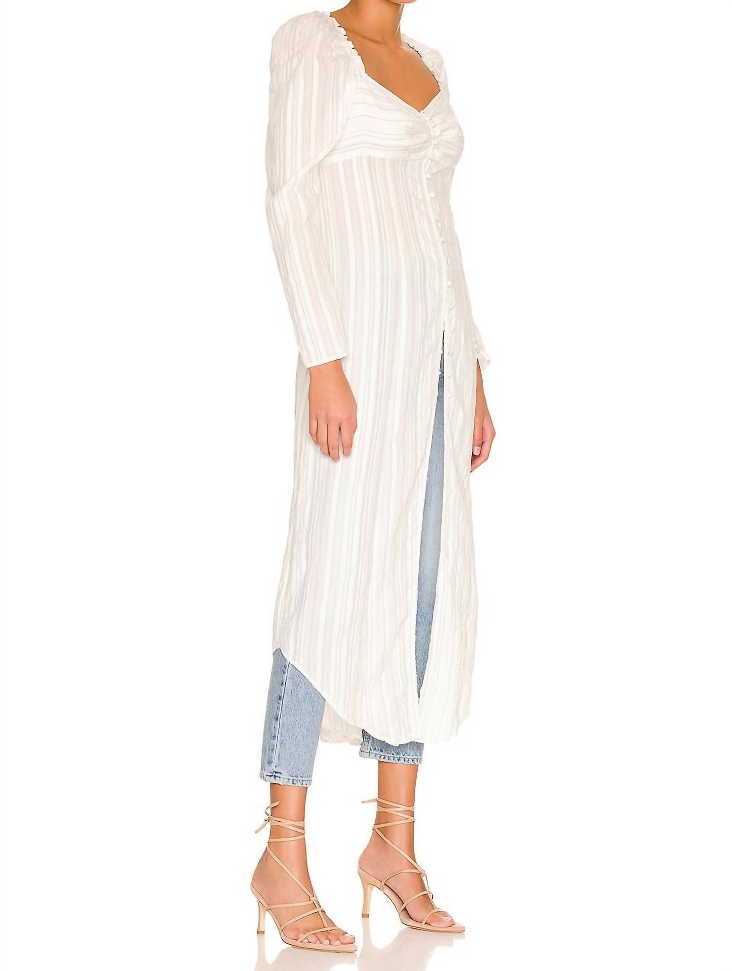 84% viscose, 15% nylon, 1% poly. Partial front loop button closure and back tie closure. Ruched bust. Loop button cuffs. Smocked back panel. Convertible styling: Can be worn as a dress. Machine wash. Made in China. Model is wearing size: XS [Height: 5'10", Waist: 23", Bust: 31", Hips: 33"]. Measurement from XS/US 0 –2 [Bust 32.5 – 33.5", Waist 25 –26", Hips 36 – 37"]