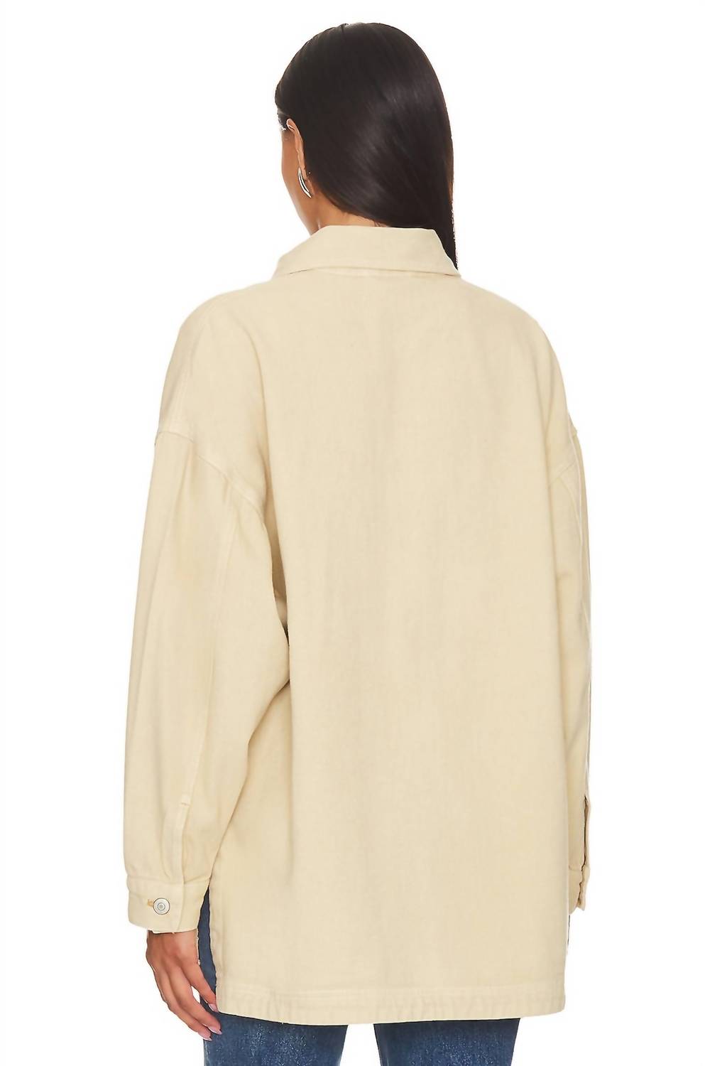 Oversized fit, hits below the hips. Soft cotton twill, button-down style, collared neckline, oversized pockets at the chest, pockets for hands, cuffed sleeves. 100% Cotton. Made in India. Machine wash.