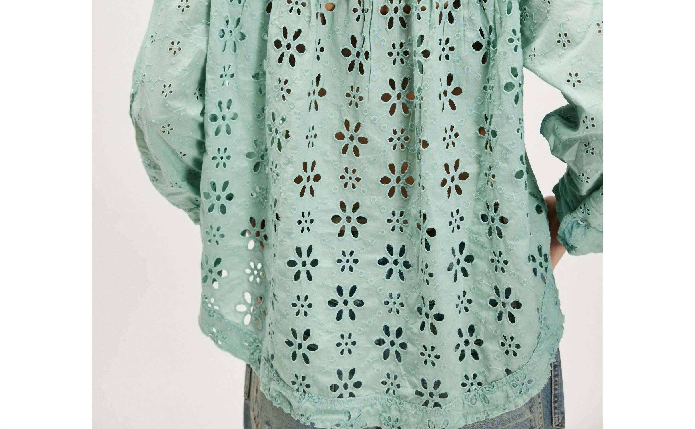 Perfectly tailored and soft to the touch. Elevate your warm-weather wardrobe with the Mae Washed Eyelet Shirt by Free People in a refreshing Faded Green Wash. This women's shirt features short sleeves and an intricate eyelet texture, offering a relaxed fit that exudes effortless style. Made from 100% cotton with a notched collar and button closure, it's perfect for summer getaways and minimalist looks. Care: Machine wash.
