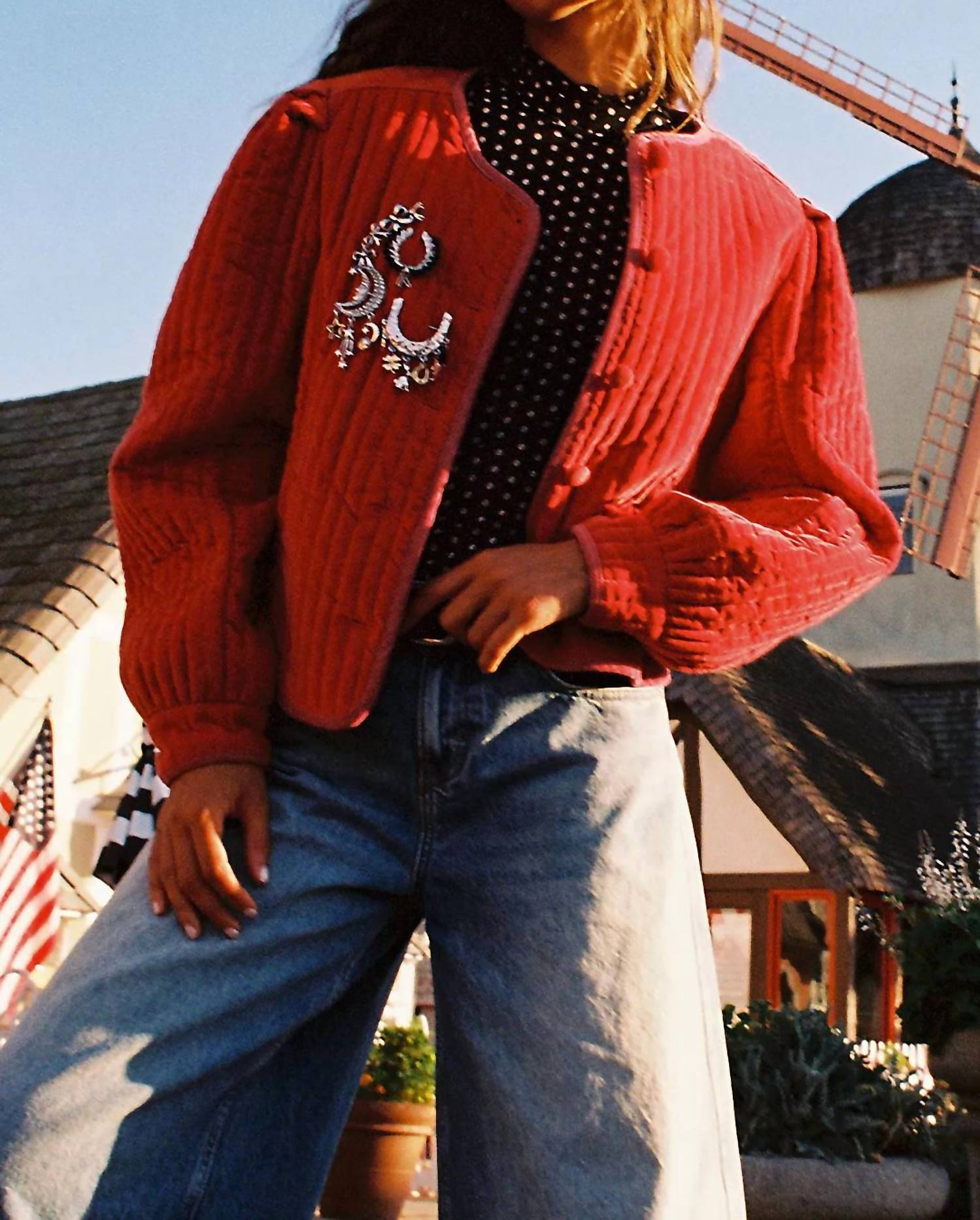 A casual yet cool jacket that every closset needs. Introducing the Natalia Long Sleeve Velvet Jacket by Free People, a perfect addition to your fall wardrobe. Crafted from 99% Cotton, 1% Elastane, this red jacket boasts a textured, collarless design with puffy long sleeves for added style. The cropped, boxy fit features a button-front closure, complemented by button cuffs, providing a versatile preppy appeal ideal for travel and Thanksgiving gatherings. Made in India, it offers practical care with machine wash and lay flat to dry instructions.