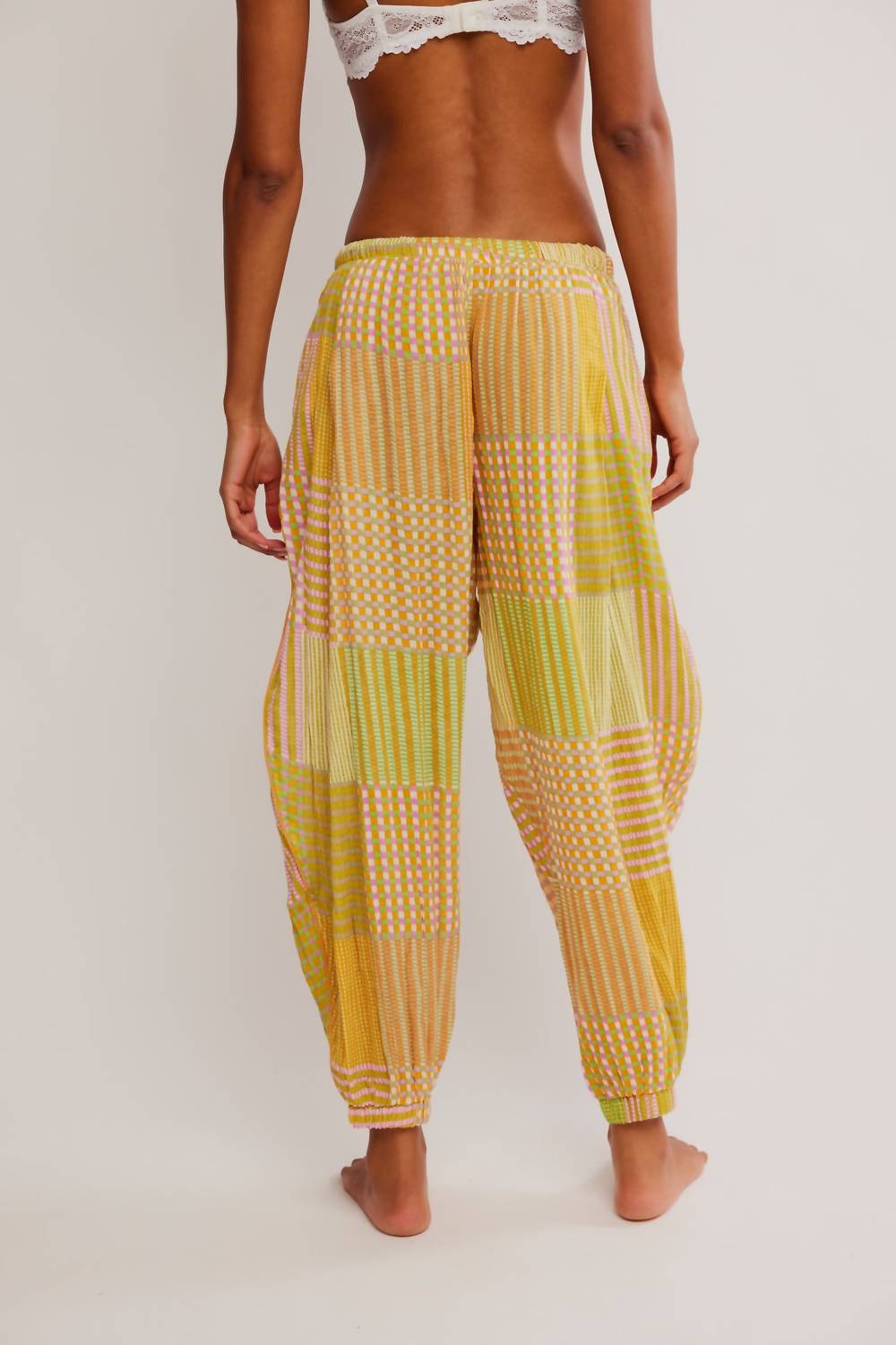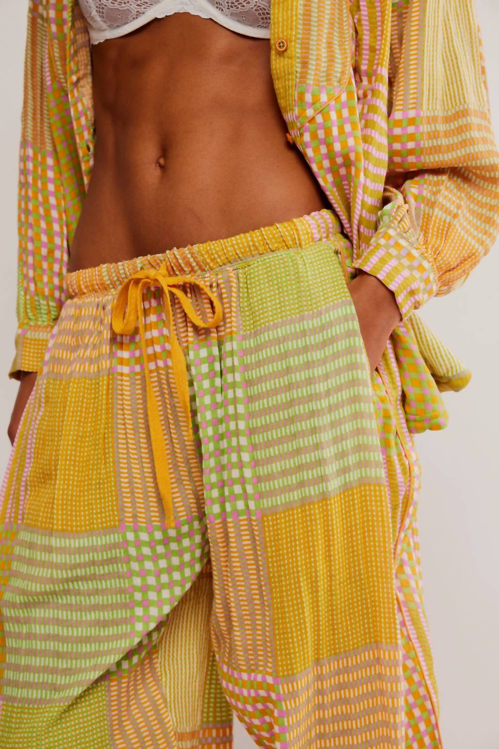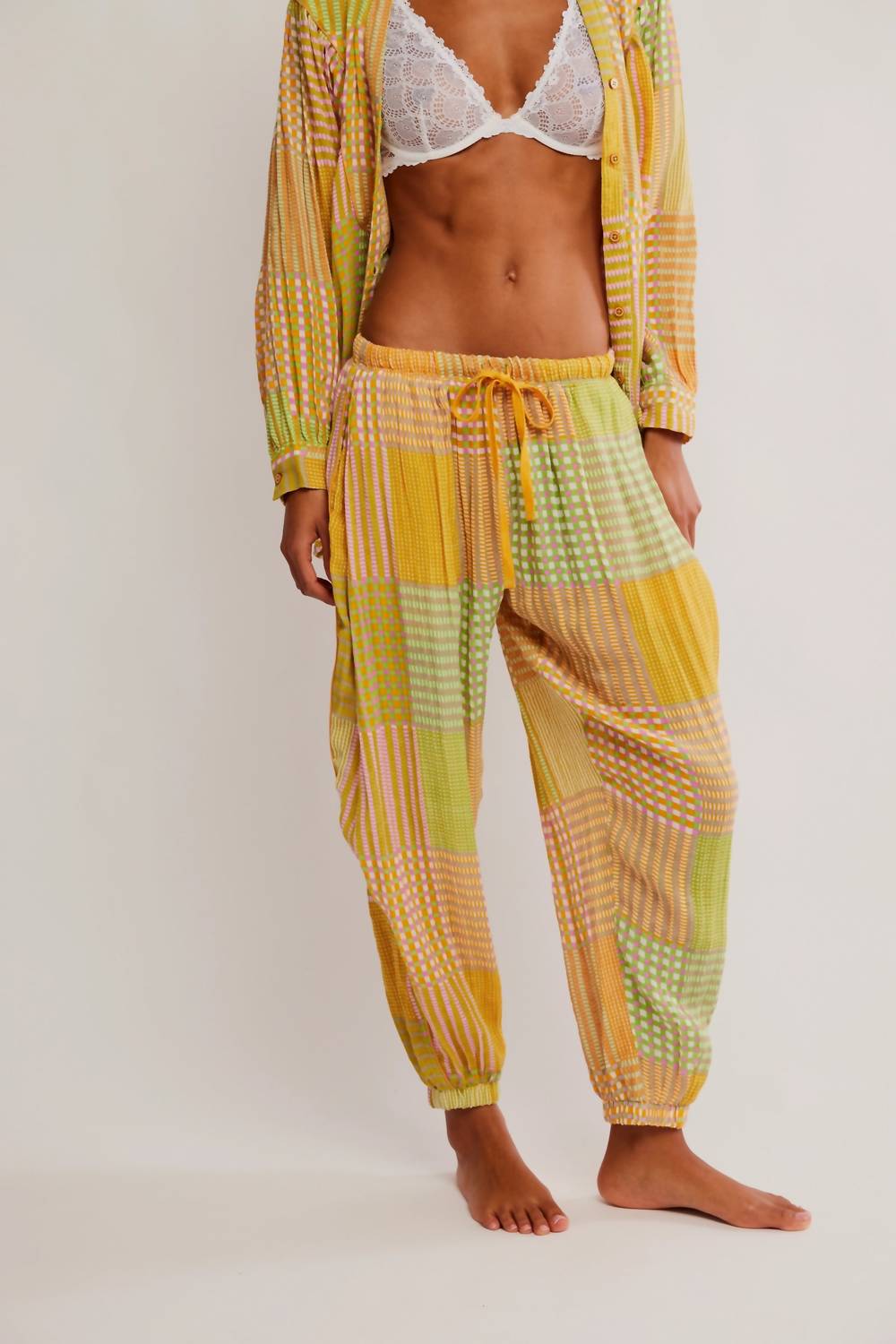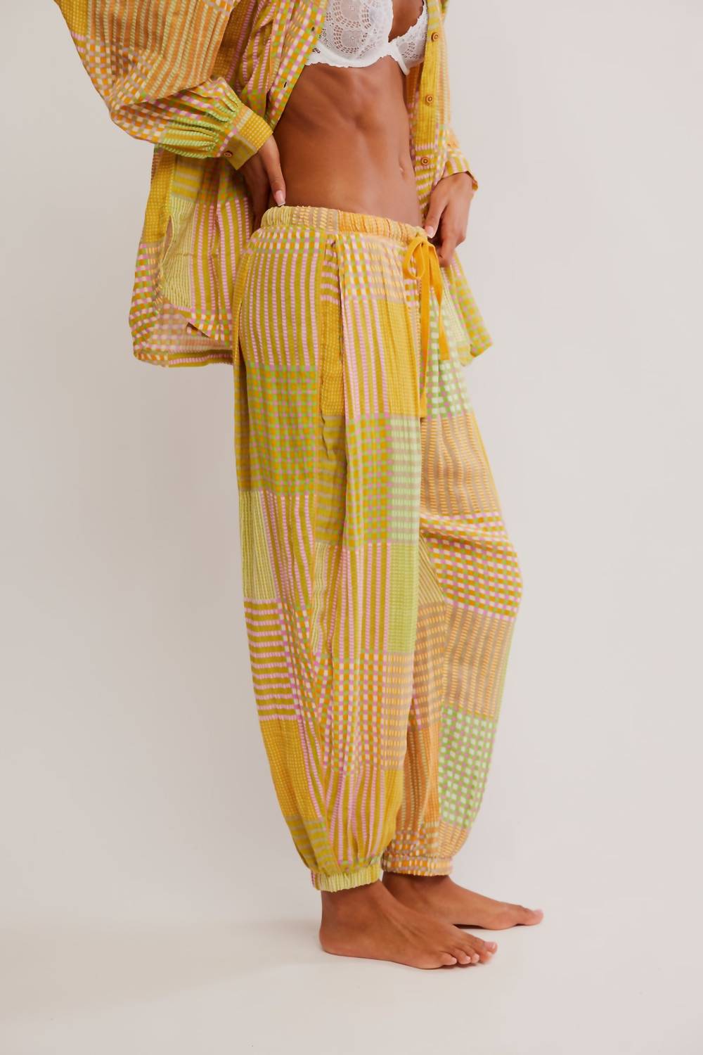The perfect piece to lounge in, sleep in, and cook breakfast in. Experience the boho charm of the Night After Night Pajama Pant by Free People, crafted in a refreshing Lemon Lime Combo. With an inseam of 27.5", leg opening of 6", front rise of 10.5", and back rise of 14.5", these joggers promise a perfect fit. Made from 100% cotton, they feature an elastic drawstring waist and practical side-seam pockets, making them ideal for a cozy night's sleep or a relaxed day. Care for yours by machine washing and line drying to maintain their vibrant, breezy appeal.