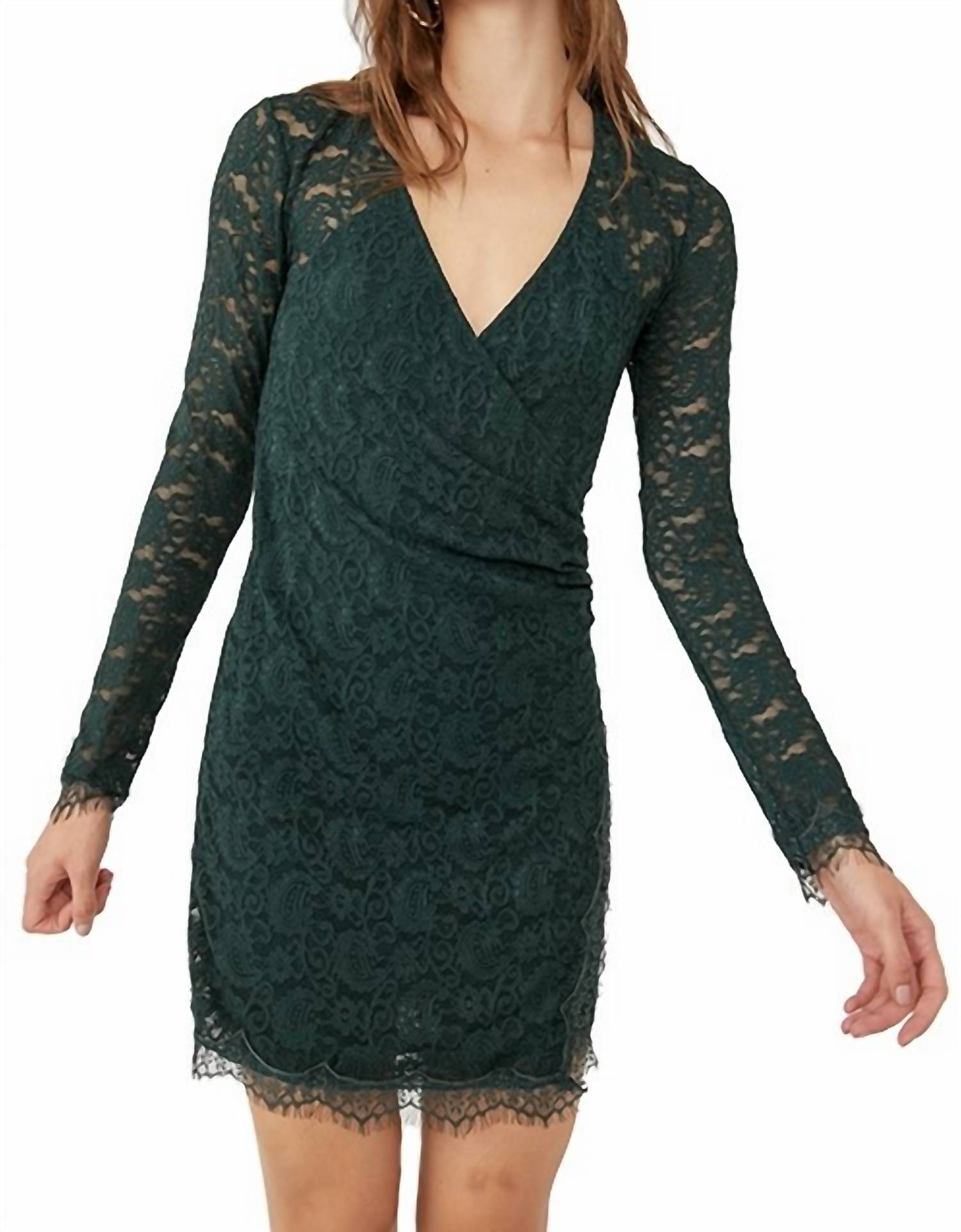 V neckline, long sleeves, fitted wrap skirt silhouetted and finished with scalloped edge lace at cuffs and hem. This pull-on dress is lined.