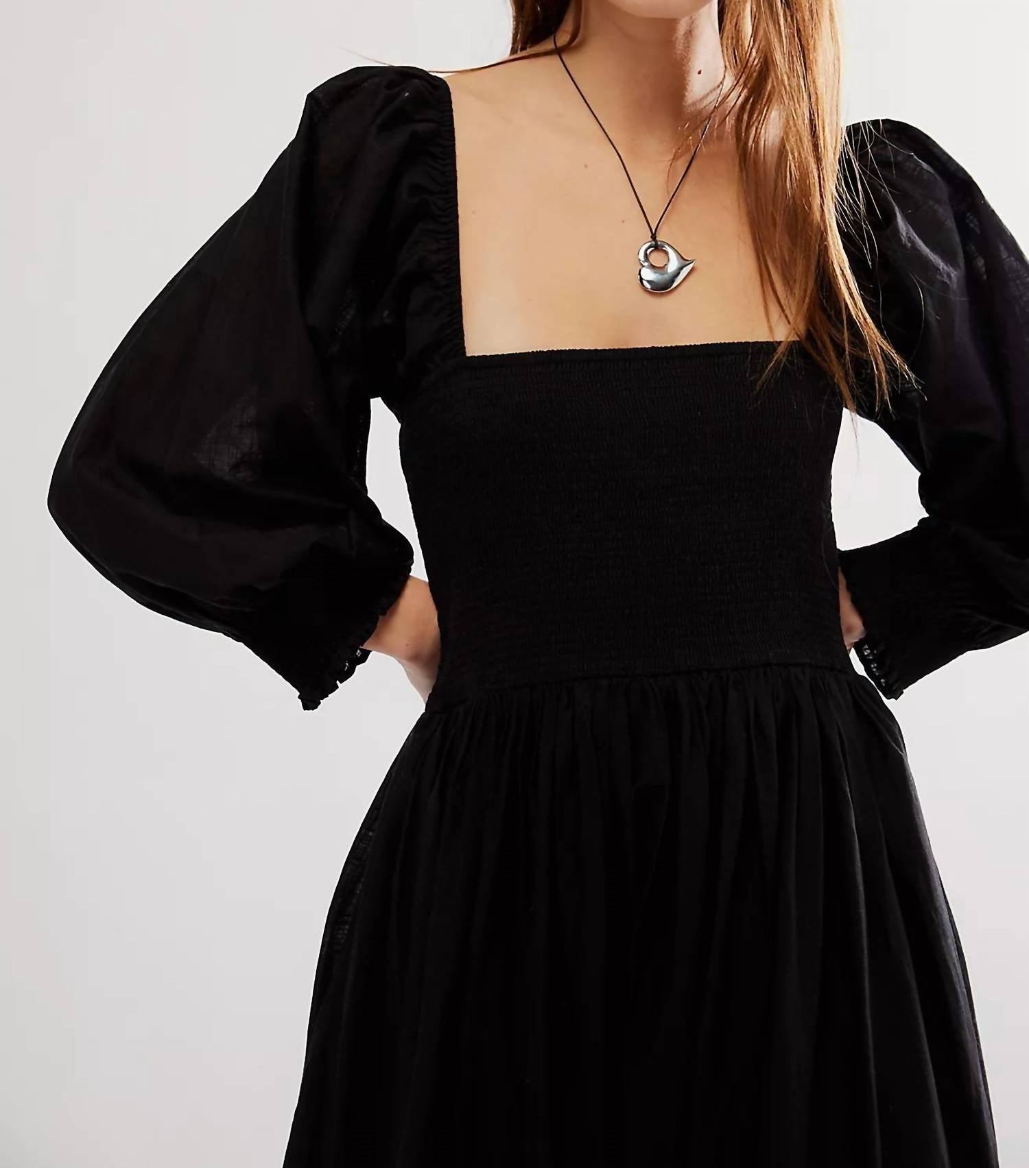 This feminine midi is featured in a soft cotton fabrication and billowy silhouette with smocking at the bodice and eyelet-inspired detailing. Fit: Fitted bodice, relaxed skirt. Features: Soft cotton fabrication, partially lined, square neckline, smocked detail at bodice, balloon-inspired sleeves with elasticated cuffs, eyelet detailing at skirt. Machine Wash Cold. Import. Measurements for size small. Bust: 25 in. Waist: 25 in. Sleeve: 22 in. Length: 44.5 in. 100% Cotton. Embroidery: 100% Polyester. Lining: 100% Viscose