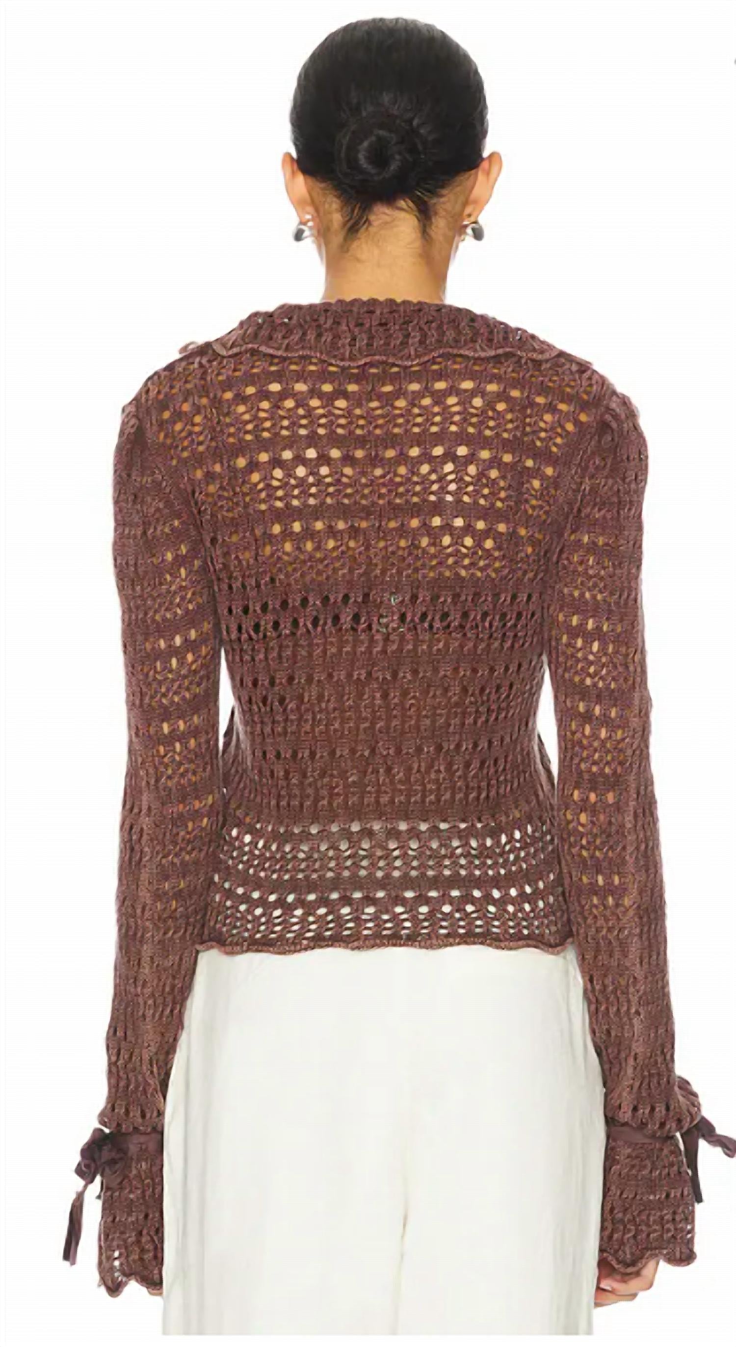 Great fit, cute design, soft fabric. You'll love everything about this long sleeve tee. Elevate your casual ensemble with the Pointelle Pullover Top by Free People, offered in a rich Chicory Coffee hue. Designed with long sleeves and crafted from a lightweight knit textile, this textured top combines style and comfort. Featuring flared cuffs with ribbon embellishment and a partial front button closure, it ensures a sophisticated touch. Care is effortless with hand wash recommended, allowing for delicate upkeep.