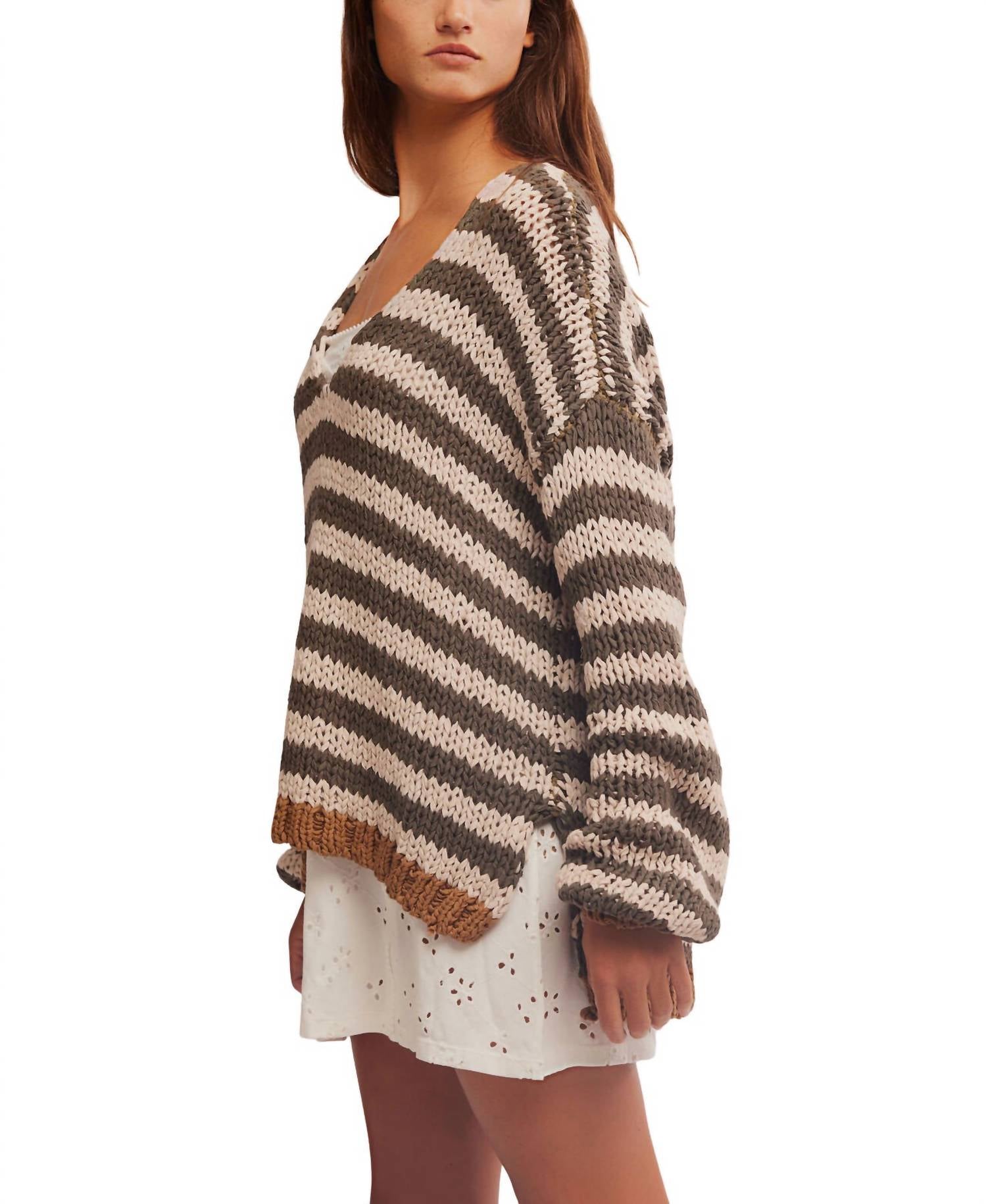 Introducing the Portland Pullover Top by Free People, a cozy knit in a chic Stripe Brown color, perfect for any occasion. This long-sleeve top features a slouchy, relaxed fit with drop-shoulder sleeves and a deep V-neckline, crafted from 100% cotton for ultimate comfort. It offers a pull-on closure and ribbed trim details, making it an ideal choice for layering throughout the seasons. Care instructions specify hand washing to ensure longevity.