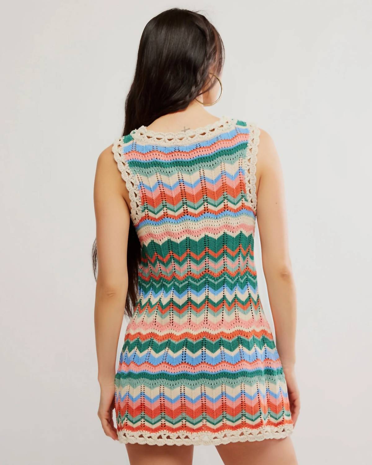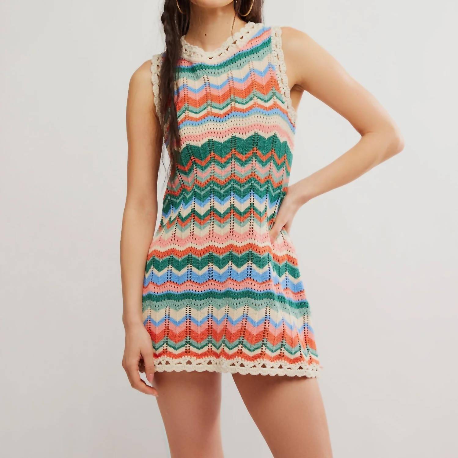 The kind of easy and flattering dress you'll be reaching for all season long. A bohemian take on a classic silhouette. Eye-catching and lightweight this dress is perfect for summer days. The fabric allows for breathability and a comfortable fit. The shift style makes it a flattering fit for all bodies. Colour: Multi stripe Round neck Mini length Straight cut Crochet-style detail 87% Cotton 13% Polyester Sandy Mae Mini Dress