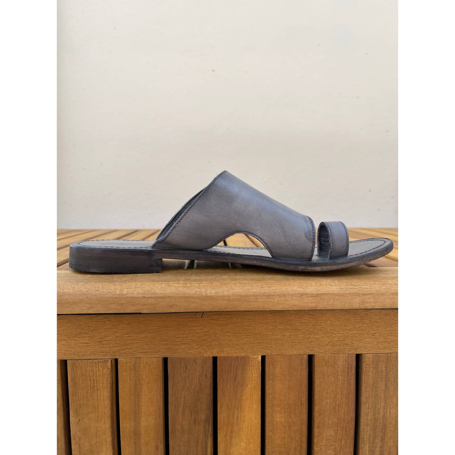 Simple leather sandals featuring an asymmetric strap and toe loop with a worn-in washed look. Slip-on style. Slight stacked heel. Note: These shoes are hand-treated, so color may differ slightly from what is pictured. Fit Note: This style runs true to size. If between sizes, we suggest sizing up.