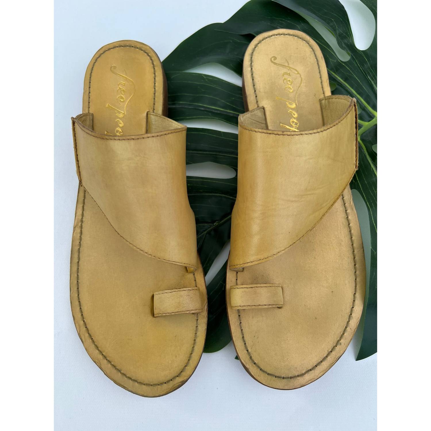 Simple leather sandals featuring an asymmetric strap and toe loop with a worn-in washed look. Slip-on style. Slight stacked heel. Note: These shoes are hand-treated, so color may differ slightly from what is pictured. Fit Note: This style runs true to size. If between sizes, we suggest sizing up.