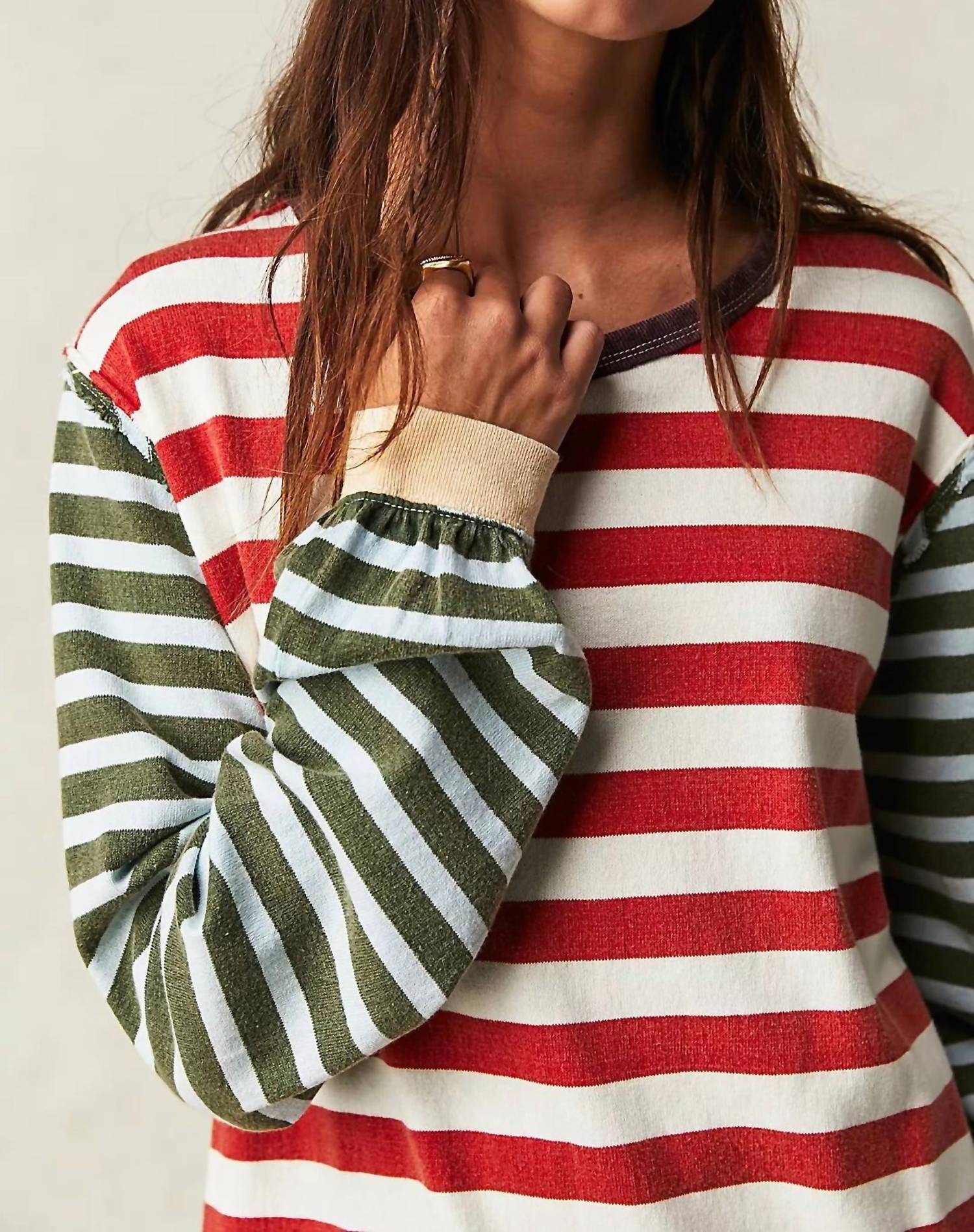 A long sleeve top you can wear with denim, skirts, well... just about anything! The Sawyer Stripe Tee by Free People is the epitome of relaxed style, featuring long sleeves and a scoop neckline for a comfortable fit. Crafted from soft cotton, this tee showcases a pieced stripe design with exposed seaming, perfect for a laid-back, vintage-inspired look. With a garment length of 29.5 inches, it includes thoughtful details like side slits at the bottom and a slightly lower back hem. It's import-friendly, offering easy care with a machine wash and tumble dry, and integrates seamlessly into any casual wardrobe.