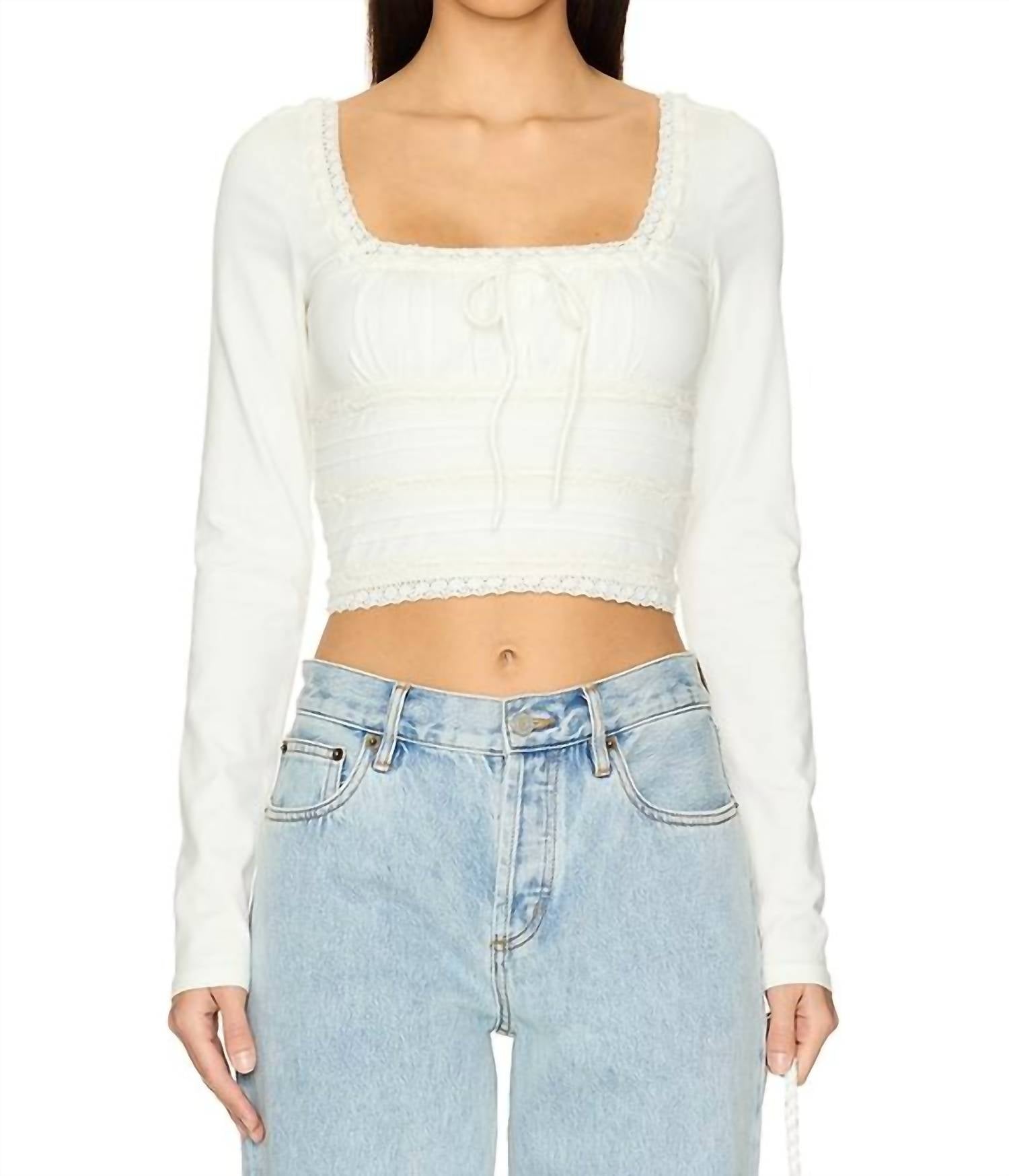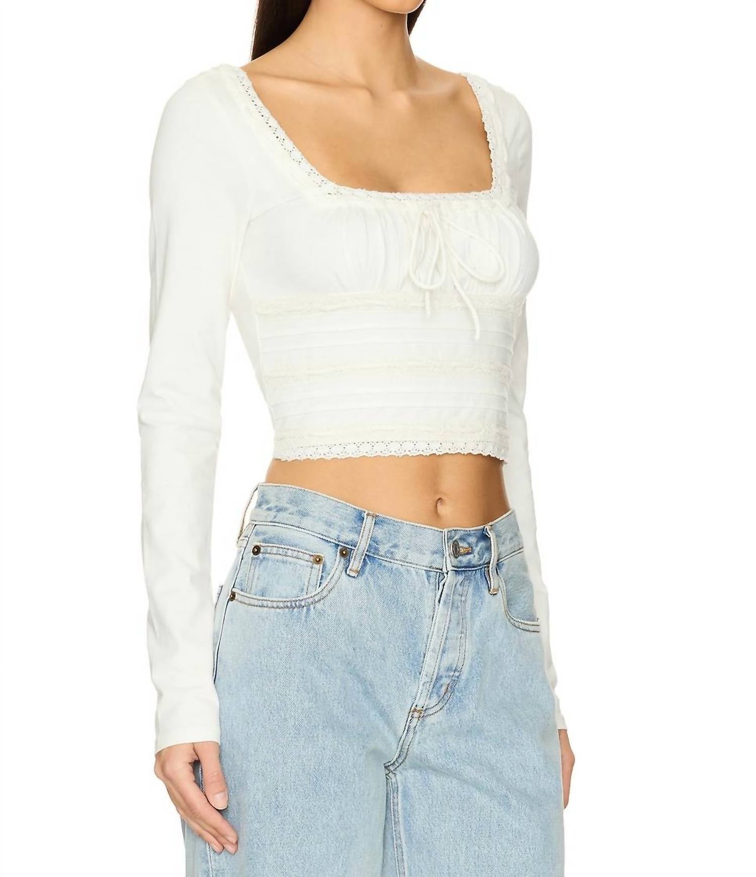 Introducing the Scarlet Smocked Long Sleeve by Free People, a chic choice for summer vacations. This long sleeve tee features a textured pattern in a sophisticated ivory hue with a square neckline and tie closure. Crafted from a cotton blend, it includes ruched detailing at the bust and elegant embroidered lace trimming, offering a minimalist yet stylish appearance. Care for this versatile top by machine washing as needed, perfect for pairing with jeans or a slip skirt.