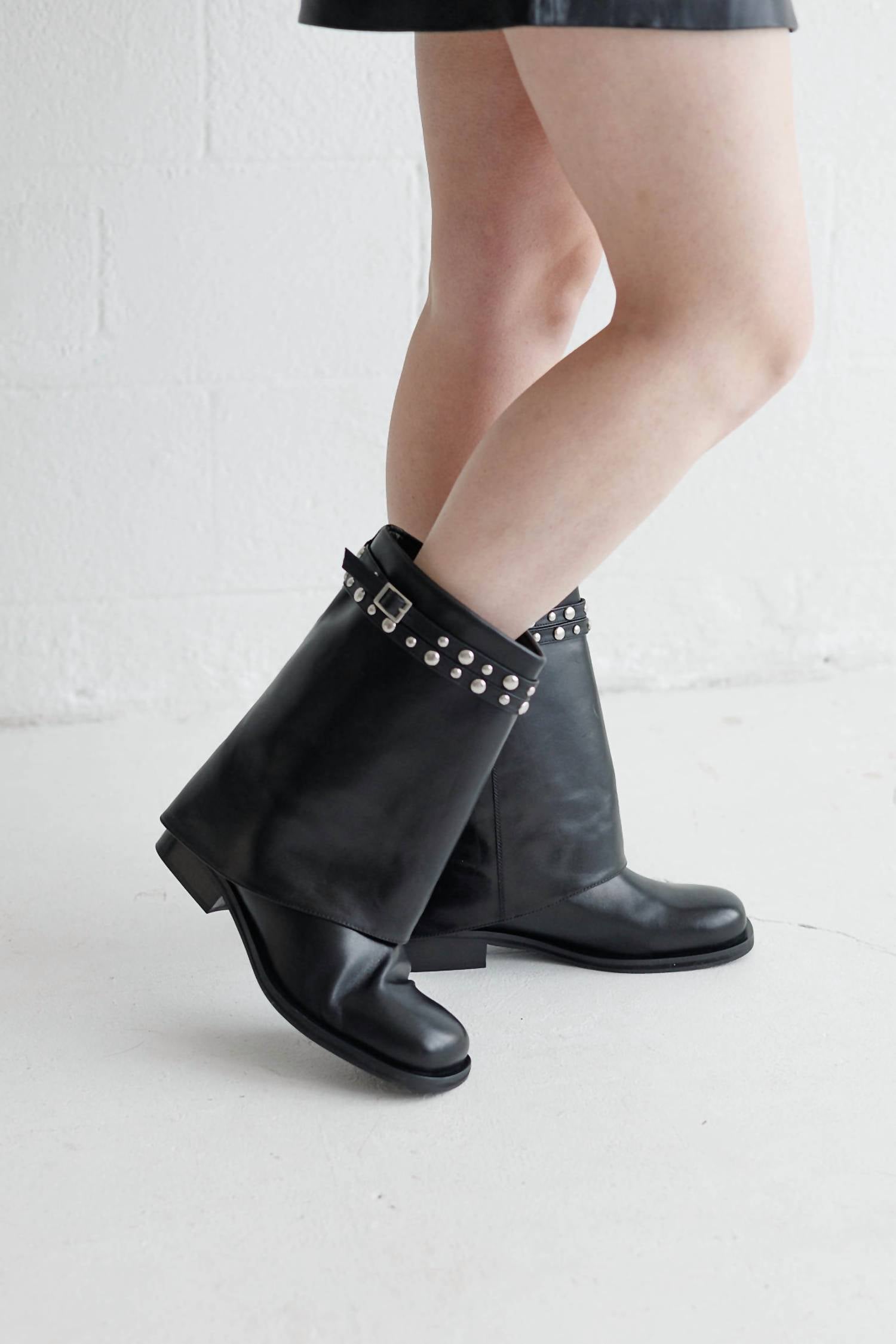 Introducing the Scorpio Studded Foldover Boot by Free People, a bold statement piece for your footwear collection. With a mid-calf height, these black leather boots feature a distinctive foldover style and studded straps with adjustable buckle detailing, offering both style and comfort. The round square toe and minimal block heel make these boots perfect for versatile styling options, whether paired with fun tights or a relaxed pair of denim. Designed for those who appreciate quality craftsmanship in every step.