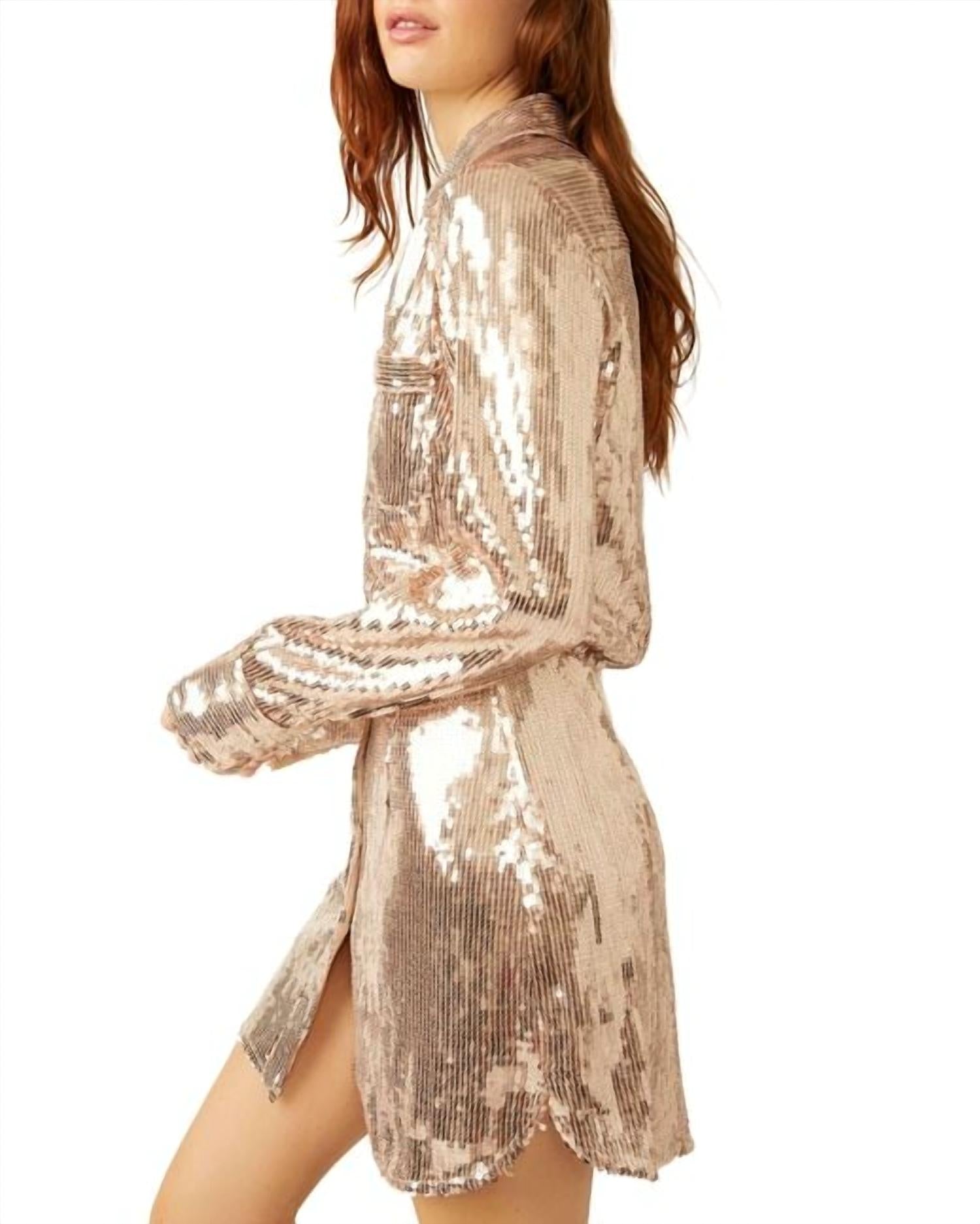 A sequined spin on a classic shirtdress silhouette, Free People's Sophie mini dress is a sparkly stunner. Point collar. Unlined. Snap front closures with hidden placket. Rounded hemline. Back yoke. Imported. Sequins may shed during wear. Cuffed long sleeves, Polyester, elastane. Hand wash.