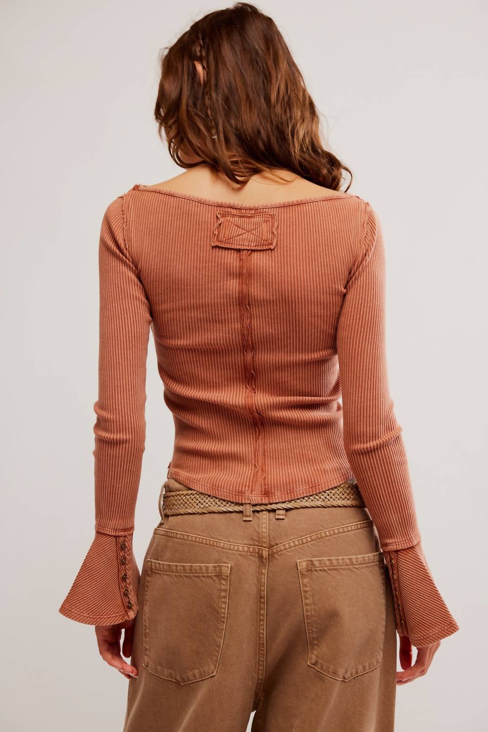 Great fit, cute design, soft fabric. You'll love everything about this long sleeve tee. Elevate your style with the Soul Sister Layering Top by Free People, crafted from a ribbed cotton blend in classic cedar wood. This top features long bell sleeves and a unique button closure, perfect for a vintage-inspired look. Composition: 97% Cotton, 3% Elastane. Care: Wash cold. Made as an import. Ideal for layering or wearing solo, it fits true to size with a crewneck design. Model is wearing size small.