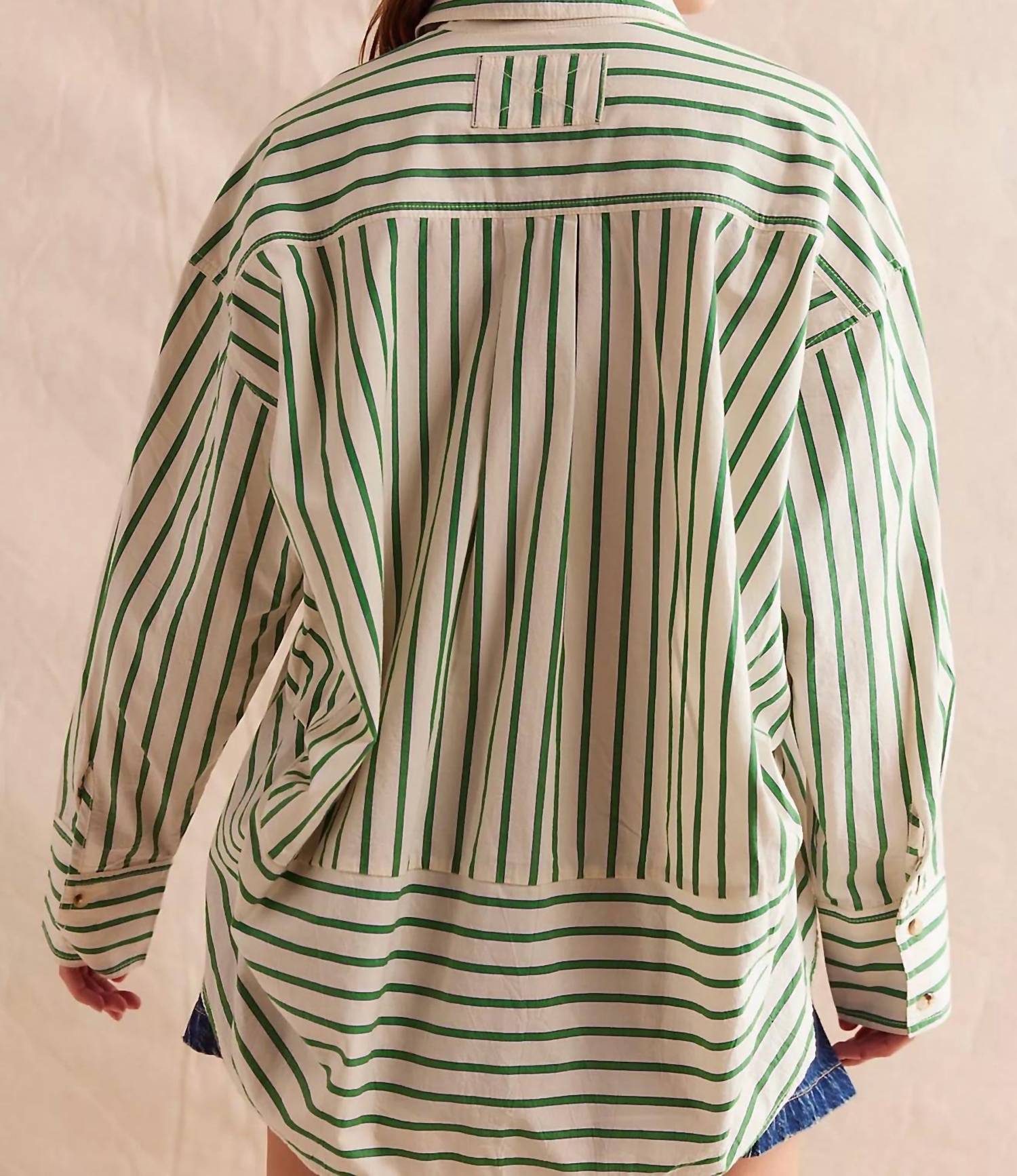 This button down shirt is comfortable yet polished. Meet the Striped Varsity Vibes Shirt by Free People, a stylish addition that elevates any wardrobe with its timeless ivory combo stripe pattern. This women's long sleeve button-down features a classic collared neckline and an oversized structured fit, enhanced with a back yoke seam for shape. Composition: 100% Cotton. Closure: Button closure. Care: Machine wash cold.