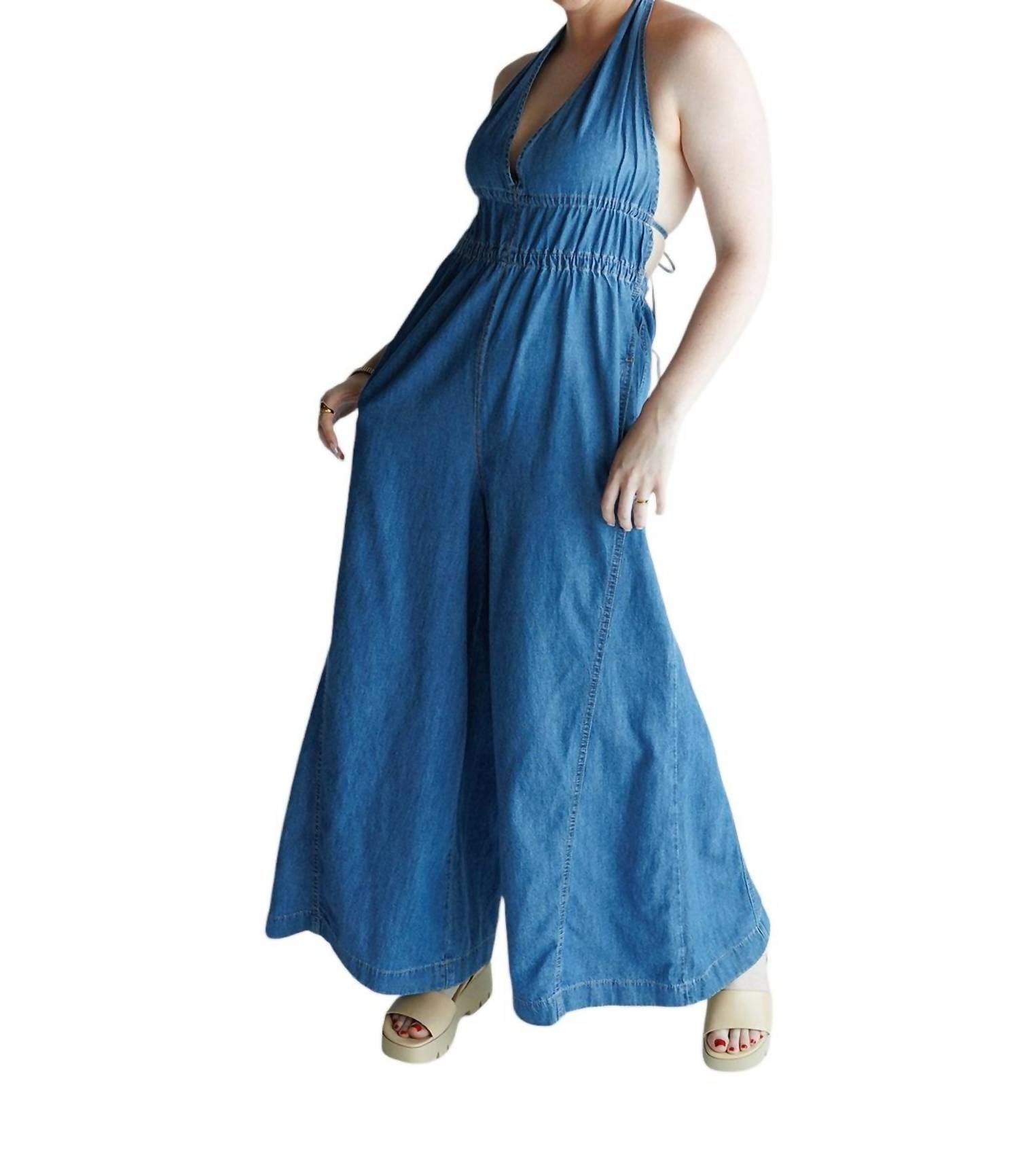 Cinched waistline, Plunged halter neckline, open back with tie closure, side pockets, soft, rigid denim—100% cotton—machine wash cold.