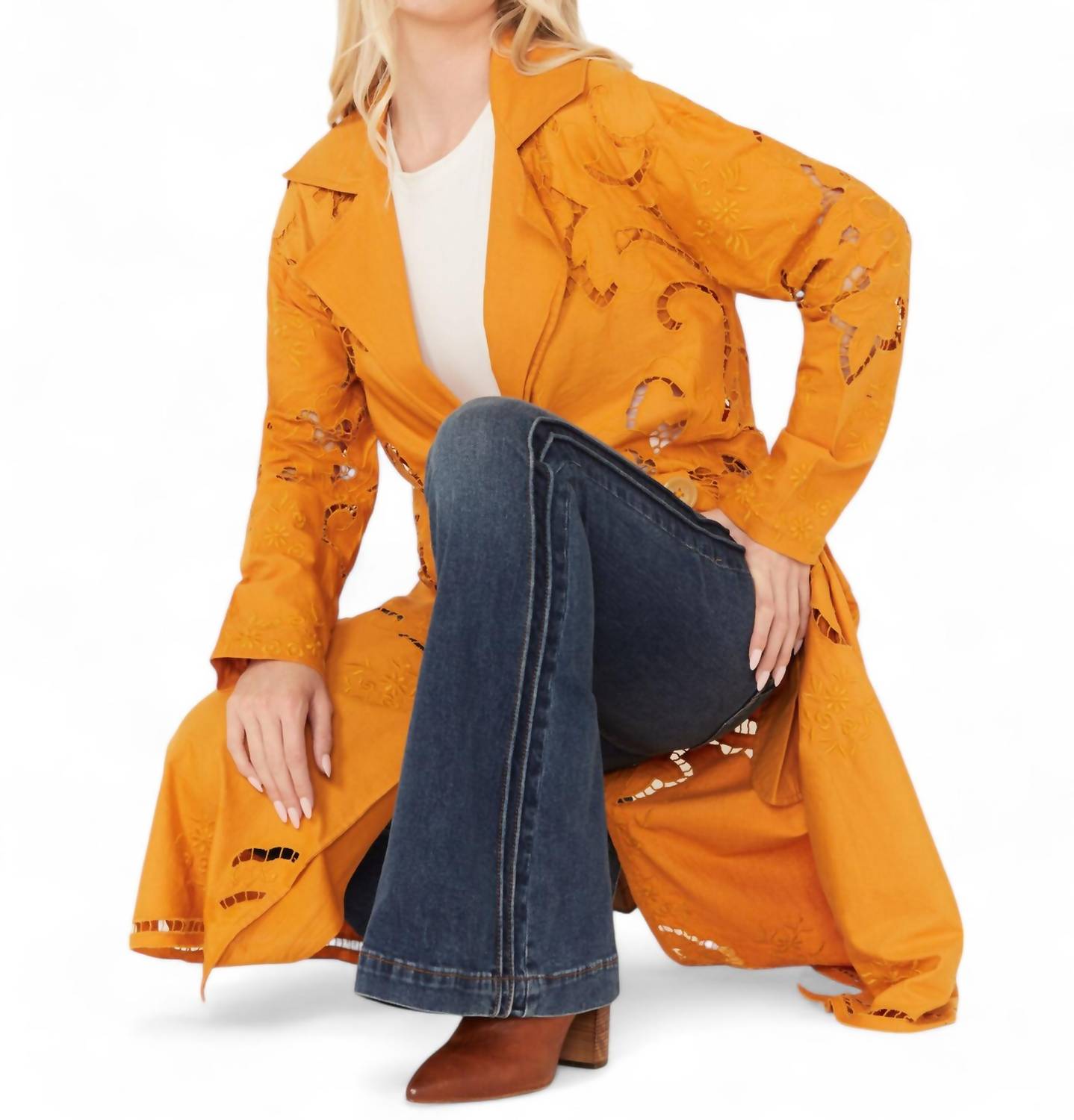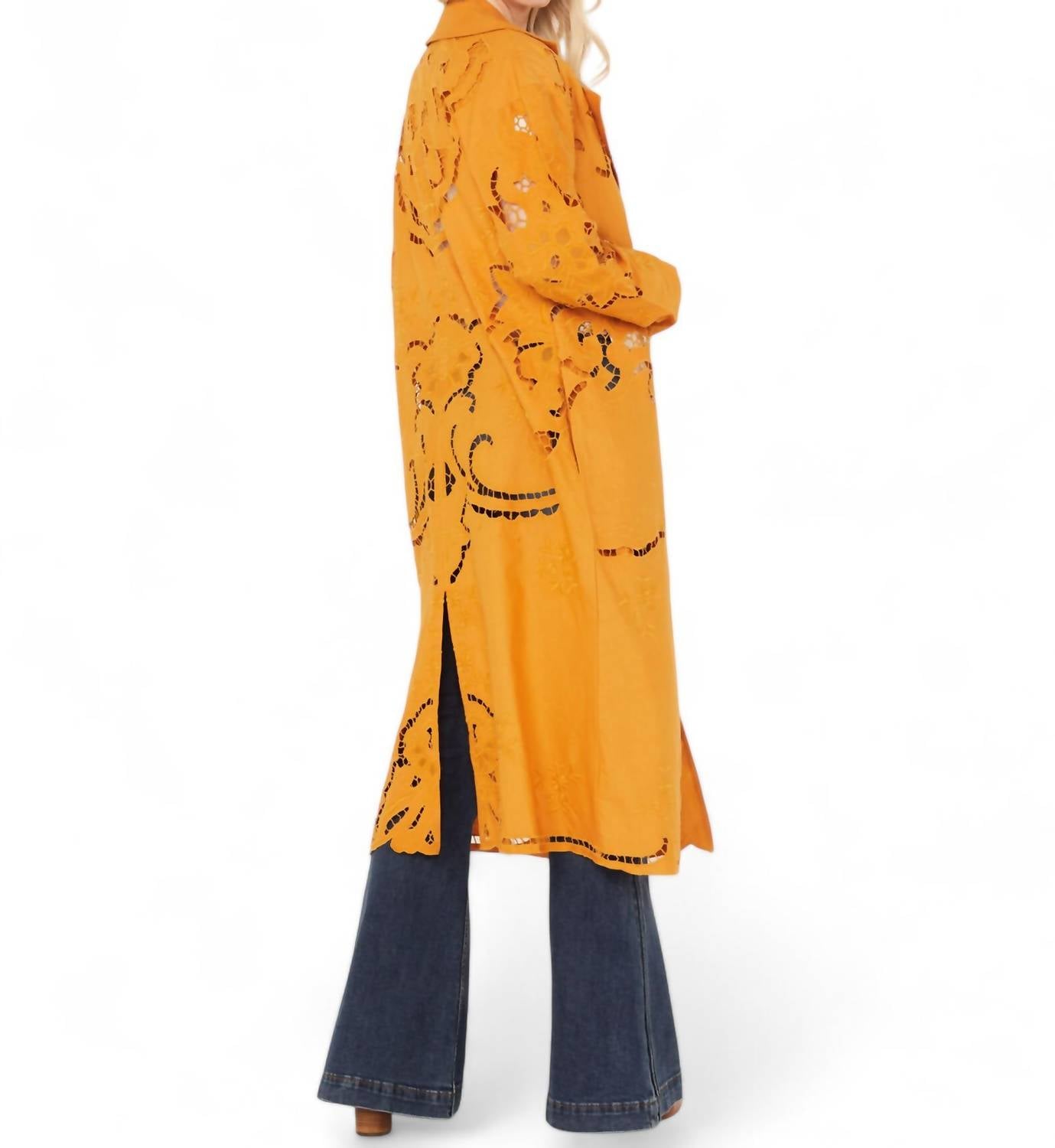 Discover casual elegance with the Susanna Duster by Free People, ideal for adding flair to your wardrobe. This coat features a vibrant solid mustard yellow design, adorned with floral embroidery and ladder lace inset panels. With long sleeves and a lapel collar, it offers a classic button-down closure. Crafted from a breathable blend of 85% cotton and 15% linen, this duster promises comfort and style, while being easy to care for with machine wash cold and tumble dry low instructions.