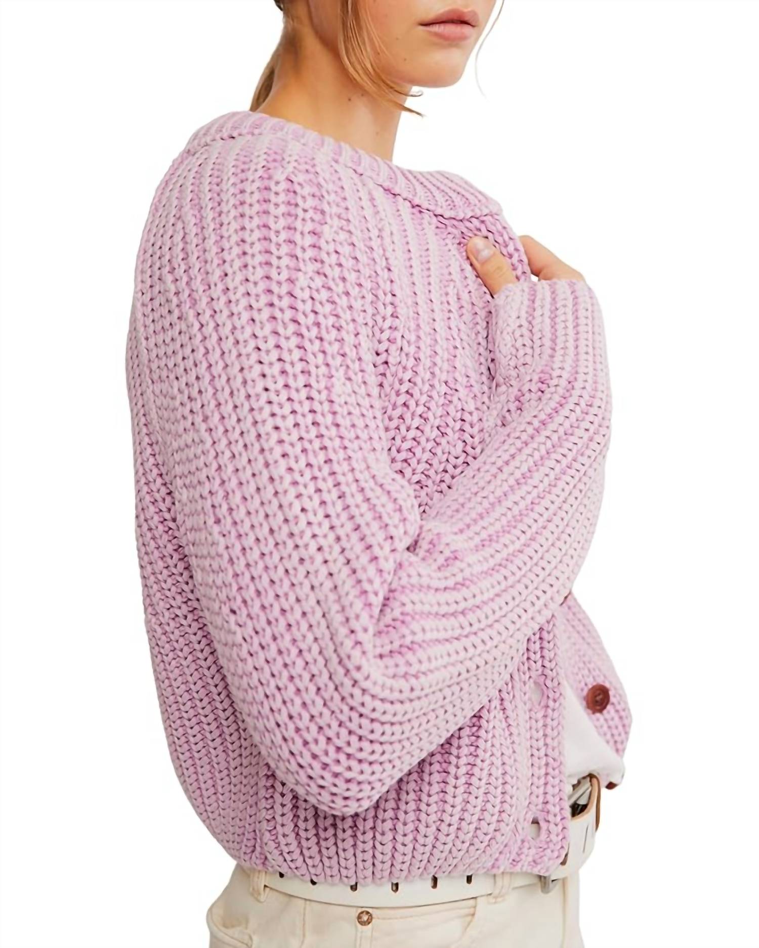A classic fit that works just as good buttoned as it does left open. This cardigan features a chunky ribbed knit construction with a slouchy, relaxed fit. It has a V-neckline, long sleeves, and a buttoned front closure, combining classic and contemporary styles. Made from 100% cotton. Length: 18" (small). Hand wash, dry flat. Imported.
