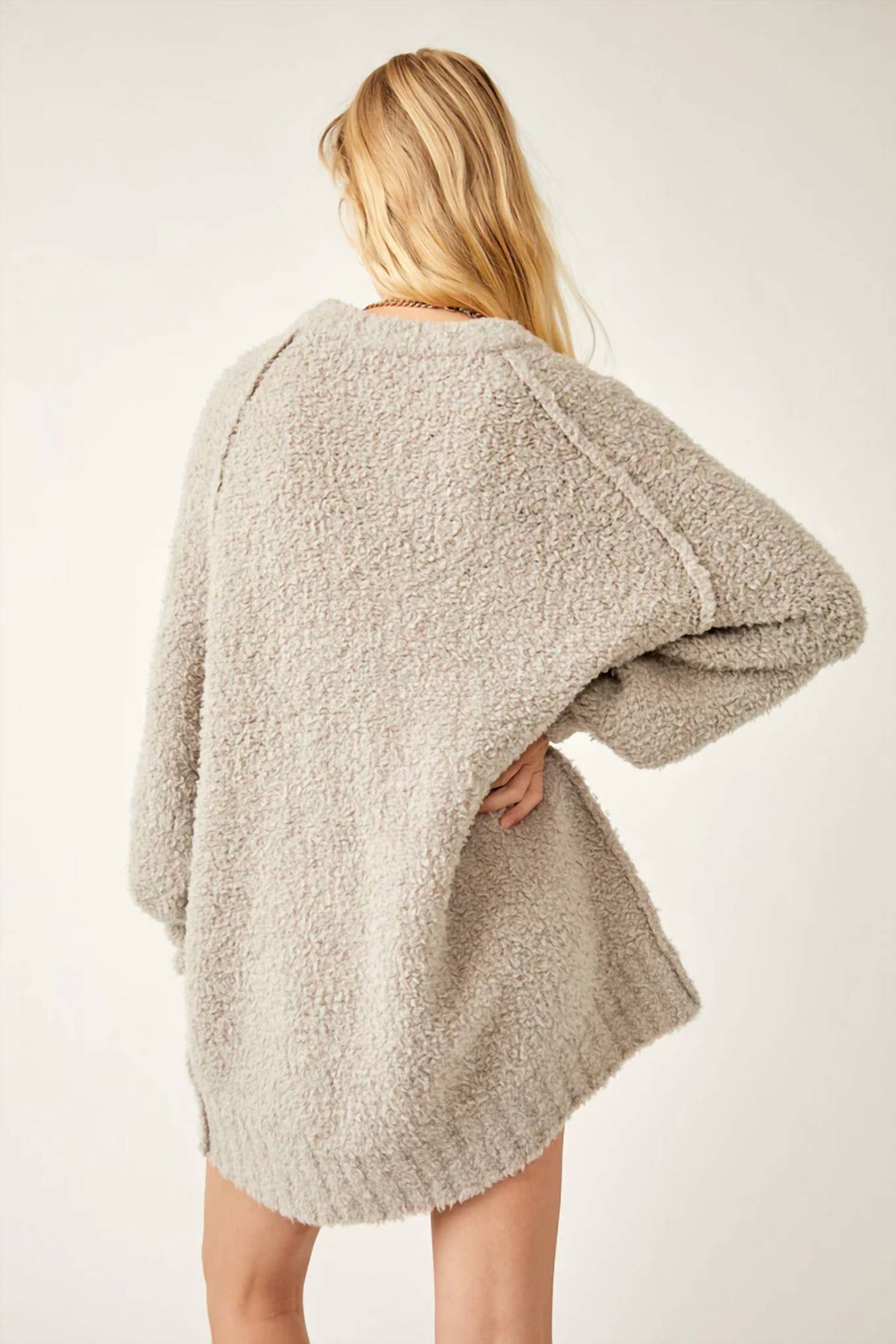 Scoop neckline, defined seaming, ribbed hems, lower back hem. Length: 27.25". Sleeve Length: 29". Oversized, slouchy fit and fuzzy fabrication. 19% Acrylic, 21% Polyamide, 30% Polyester, 30% Wool.