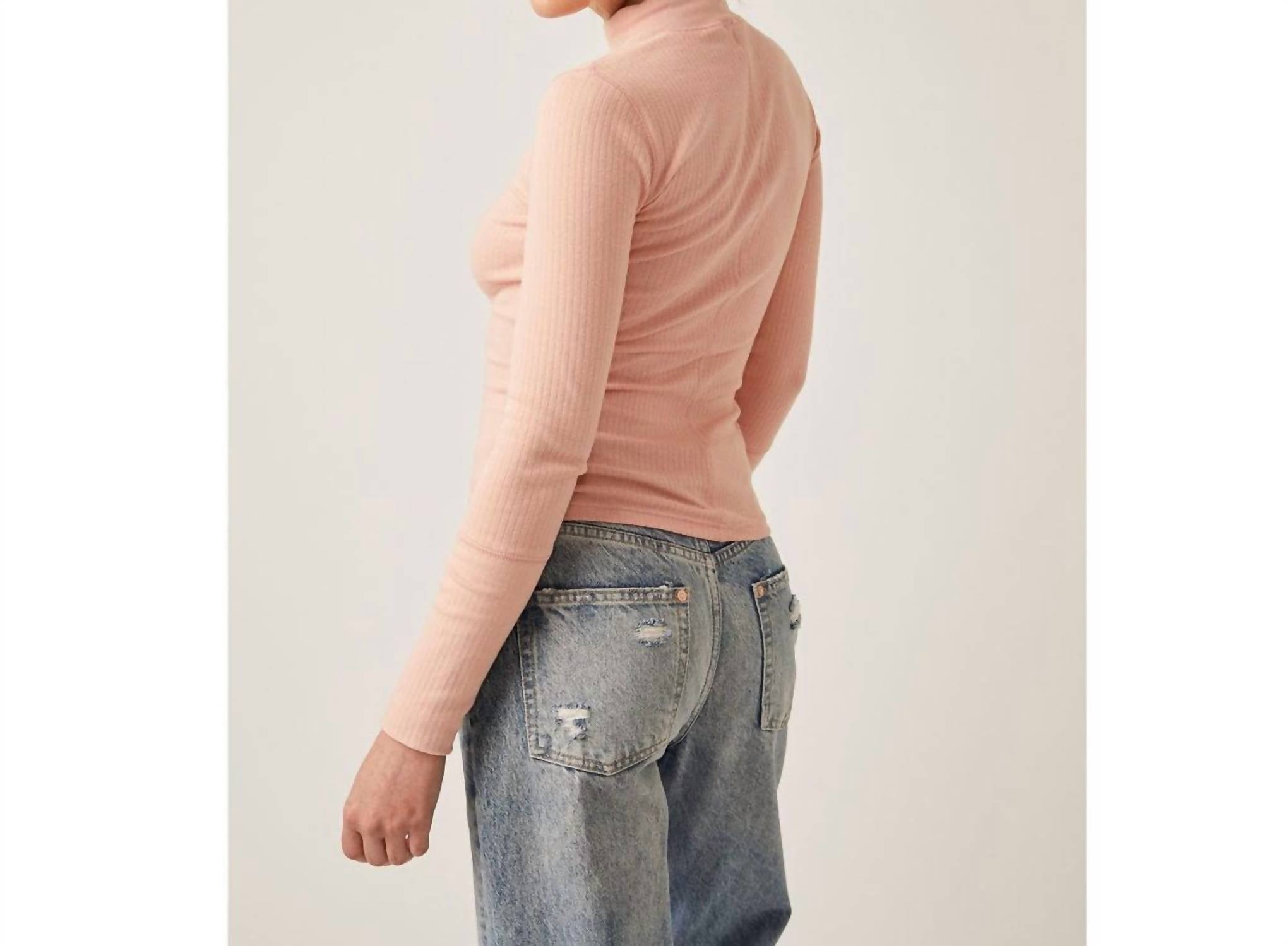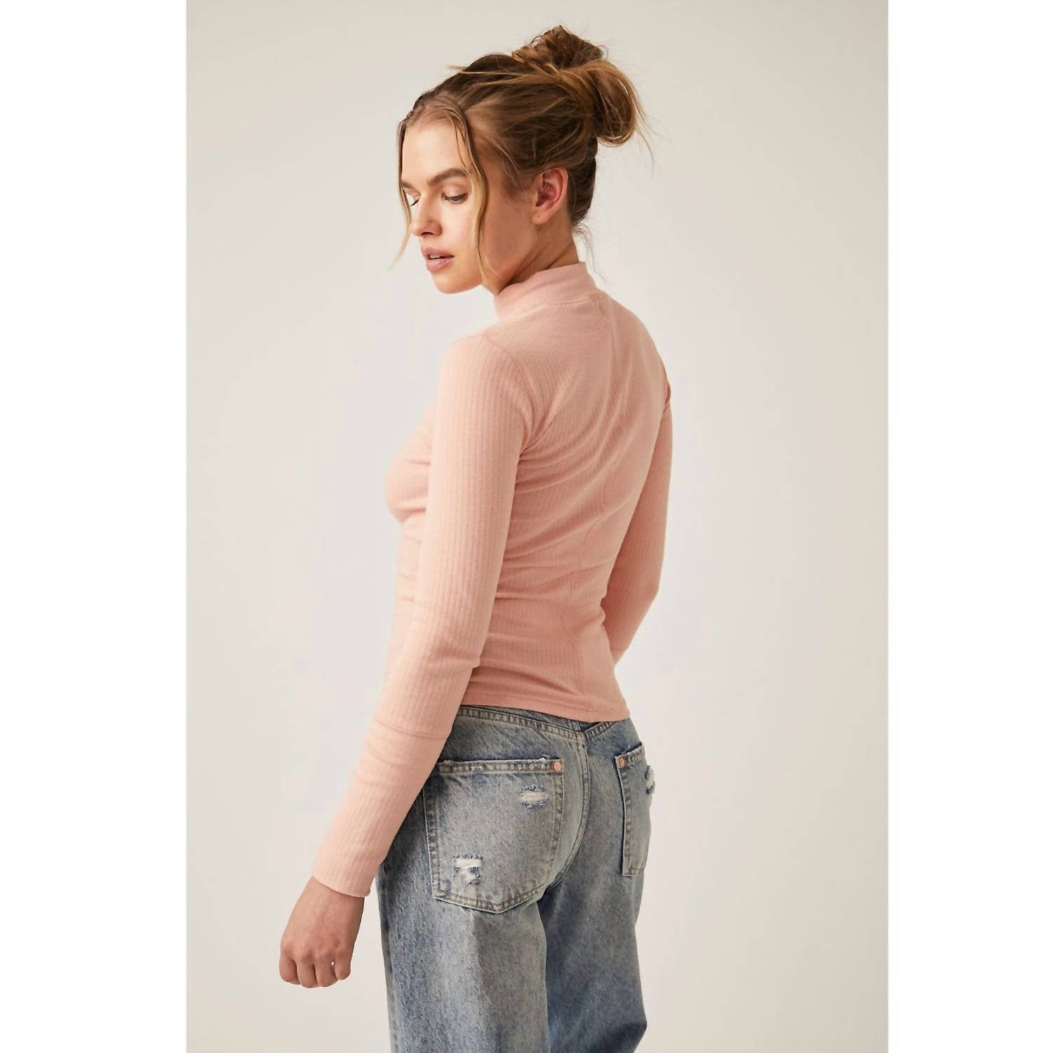The Free People top is made of ribbed knit fabric with a mock neckline and long sleeves. It has a fitted design and pullover construction, measuring approximately 22.25" in body length. The material is a cotton and spandex blend, and it is machine washable. Imported.