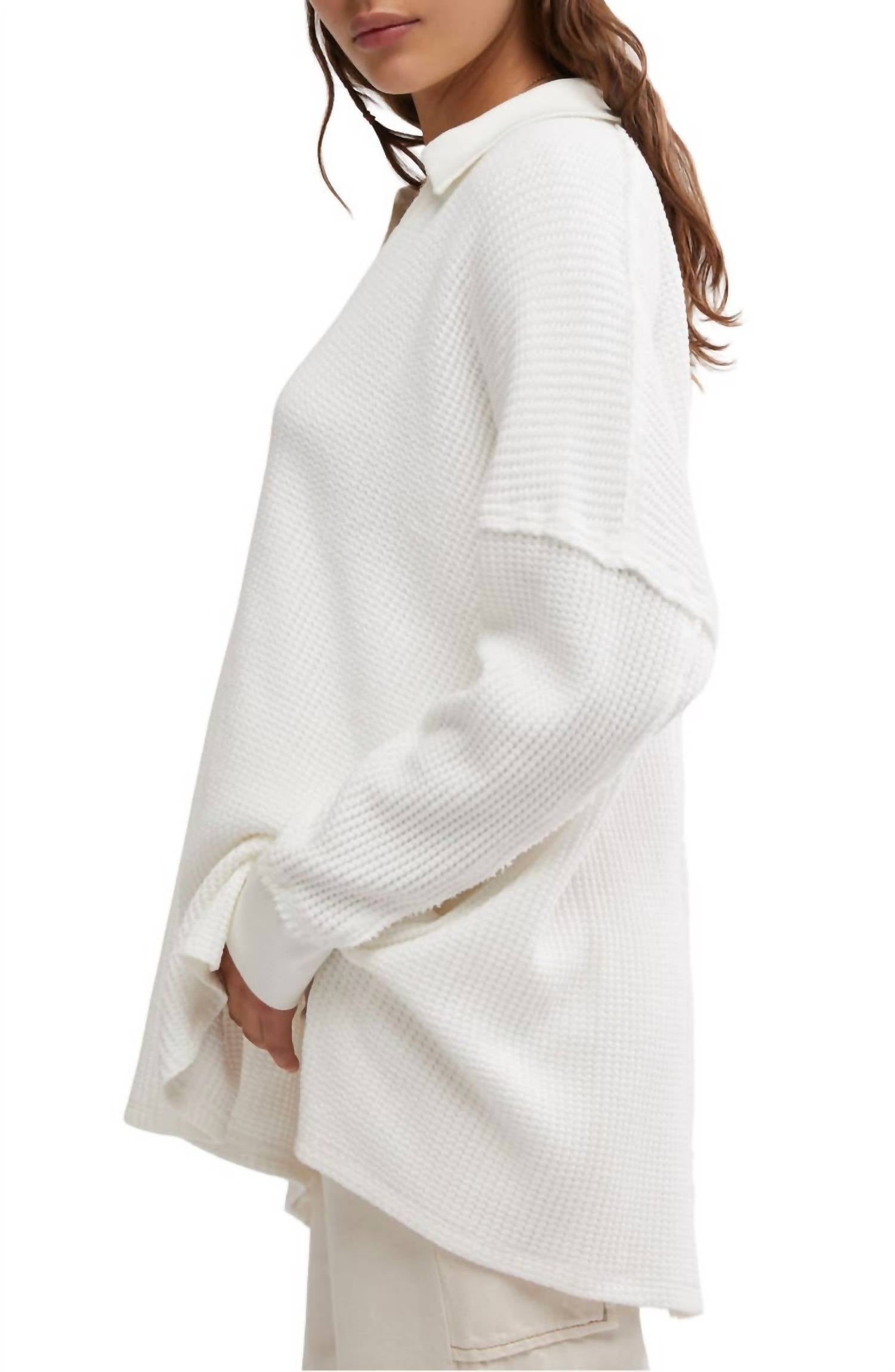 The perfect long sleeve tee that goes with just about anything. Discover the relaxed elegance of the Travis Oversize Thermal Polo Top by Free People, crafted in a soft cotton blend with 97% cotton and 3% spandex. This ivory long sleeve top features a split neck with a spread collar, offering both comfort and style. The garment’s 29" length adds a flattering touch to any outfit, perfect for layering or wearing solo. Designed with convenience in mind, this piece is imported and easy to care for with machine wash and tumble dry instructions.