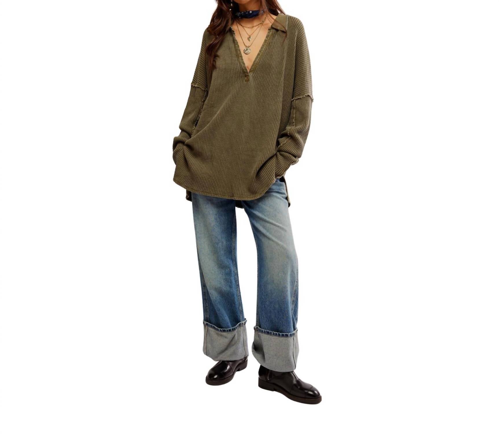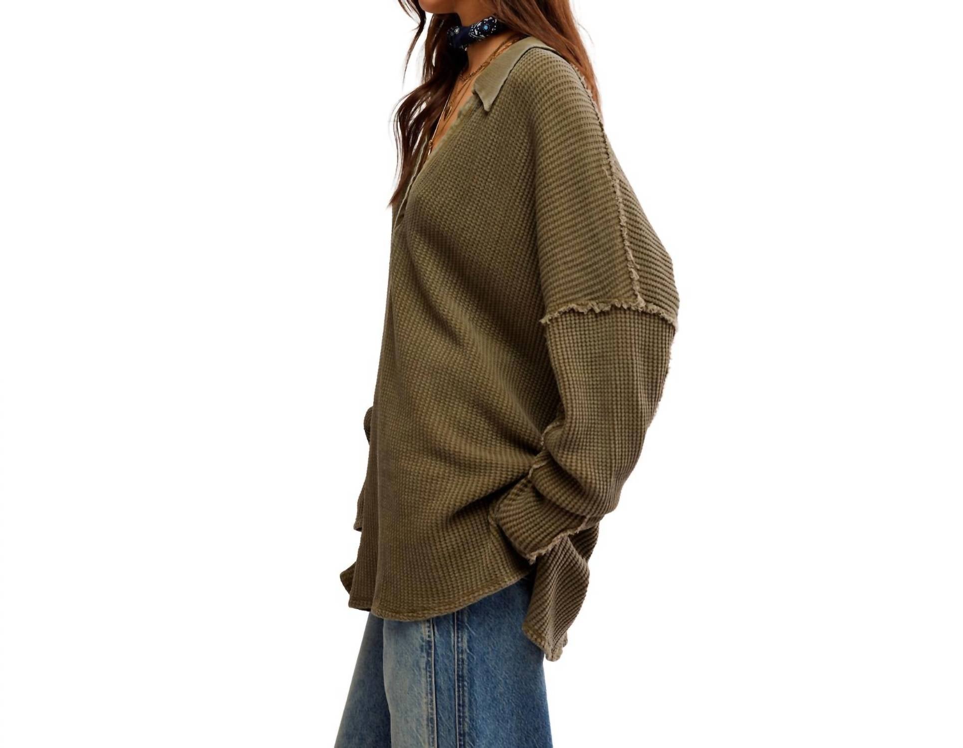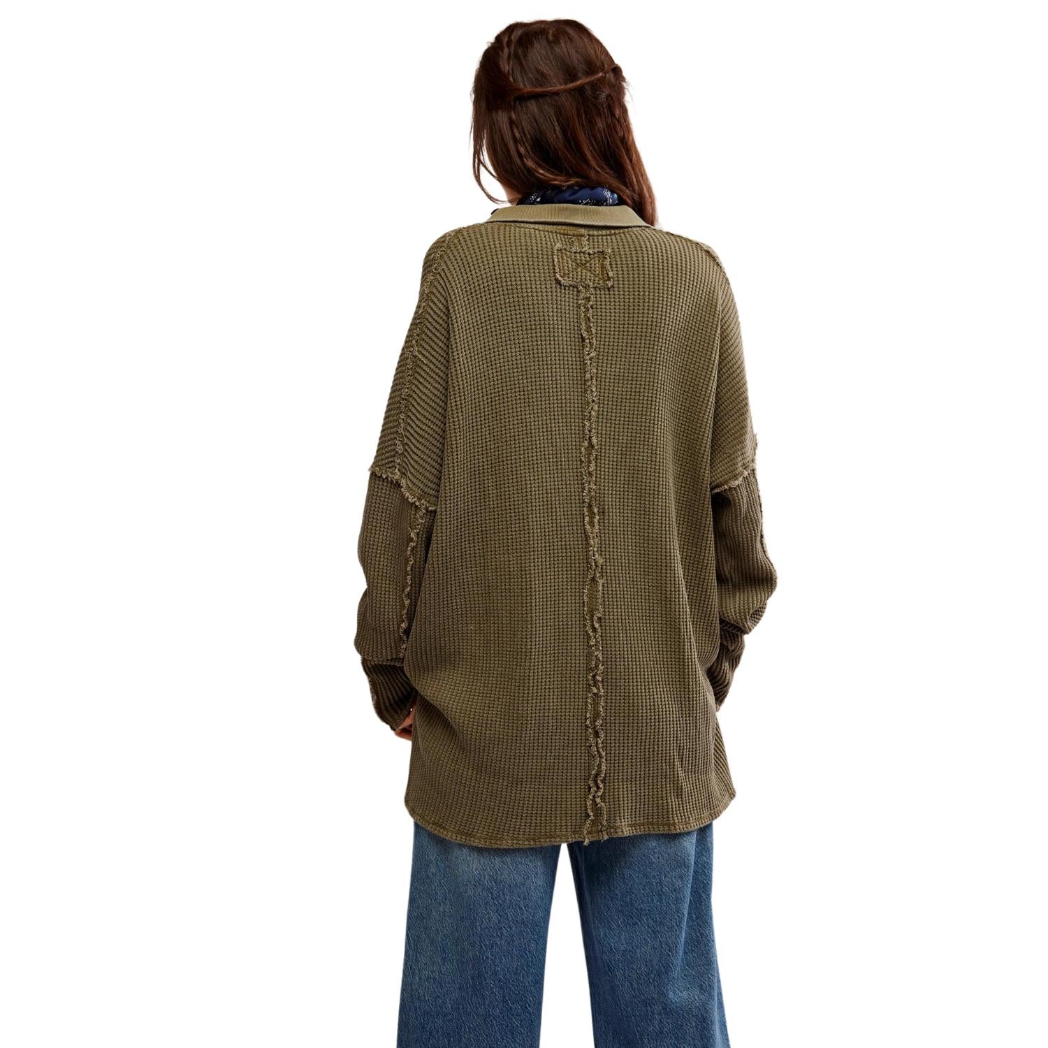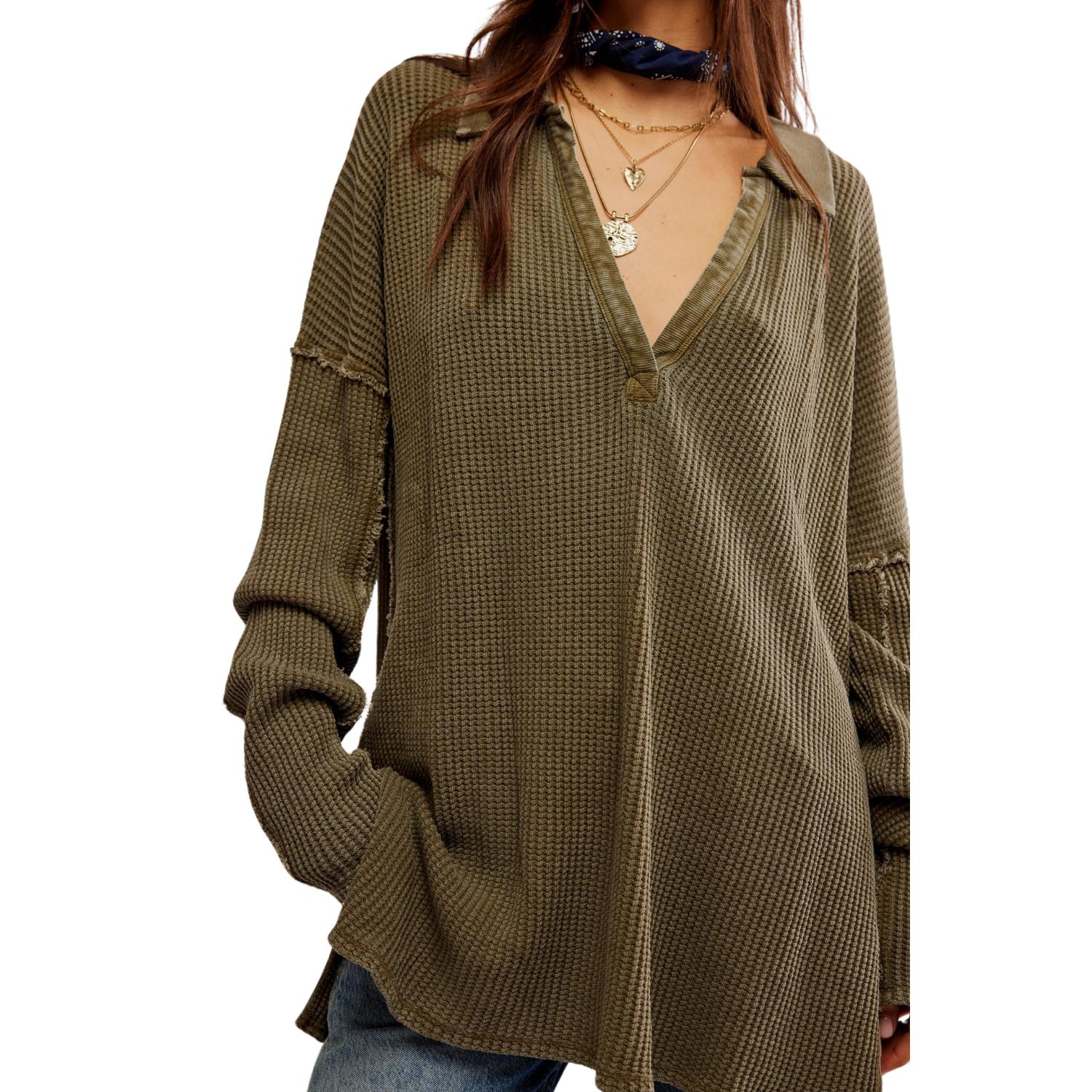 Cozy fabric, impeccable design - Meet the sweatshirt that you'll never want to take off. This top is featured in a waffle-knit fabrication with an oversized fit, collared neckline, and drop-shoulder sleeves. Made from 97% cotton and 3% elastane, it measures 29.5" in length. Machine wash cold. Imported.