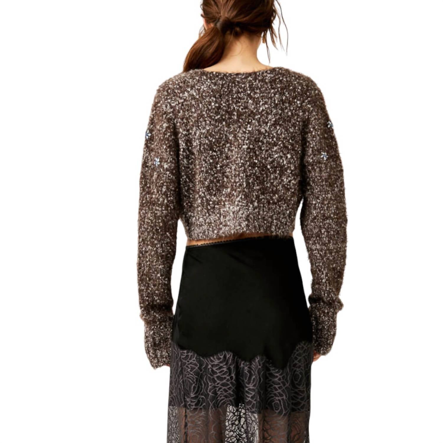 Introducing the Twinkle Cardigan by Free People, a chic blend of contemporary style and cozy comfort. With long sleeves and a cropped length, this cardigan is crafted from a soft knit material, accentuating its textured design. The garment features a pull-on closure and an adjustable tie on the V-neckline, adding a touch of personalization and flair. Perfect for the winter season, this statement piece is an ideal addition to any stylish wardrobe.