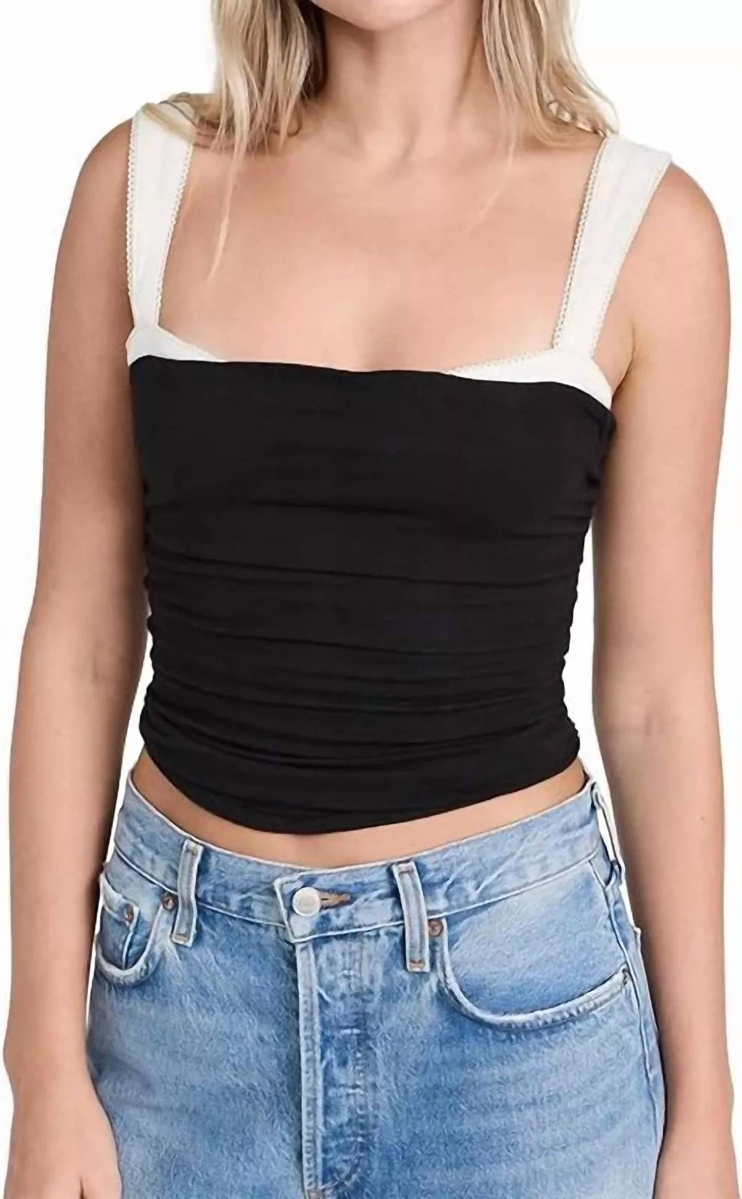 Slim-fitting silhouette. Straight neckline. Contrast shoulder strap detailing. Soft, stretchy fabrication. Picot trim. Low scoop-back detail. Hip-length style. 100% Cotton. Machine wash cold. Imported.