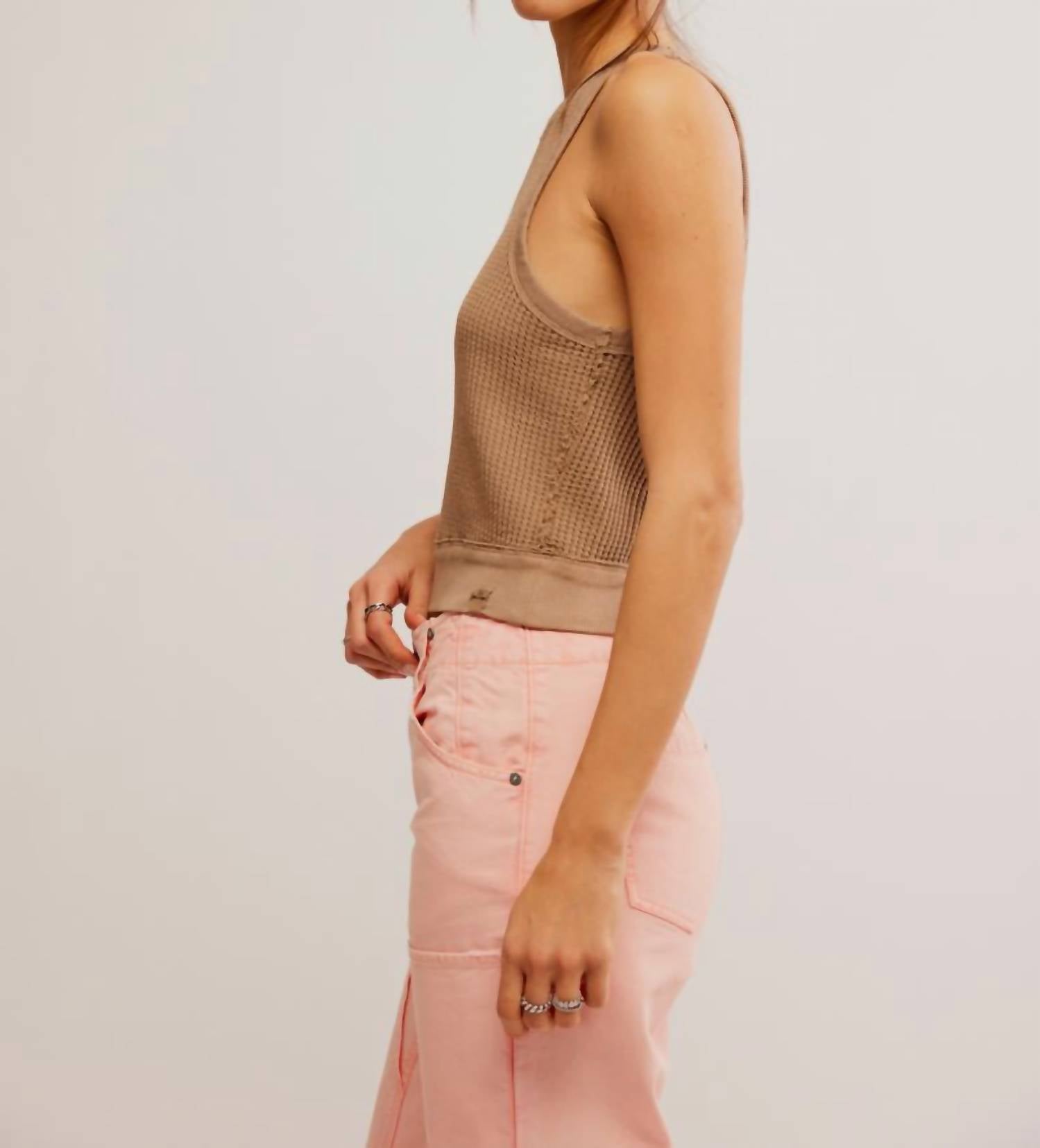 KNIT TANK TOP. 100% COTTON. CONTRAST: 96% COTTON 4%ELASTANE. Waffle knit. Sleeveless. Stretch fabric. Hand Wash Cold. Made in the USA.
