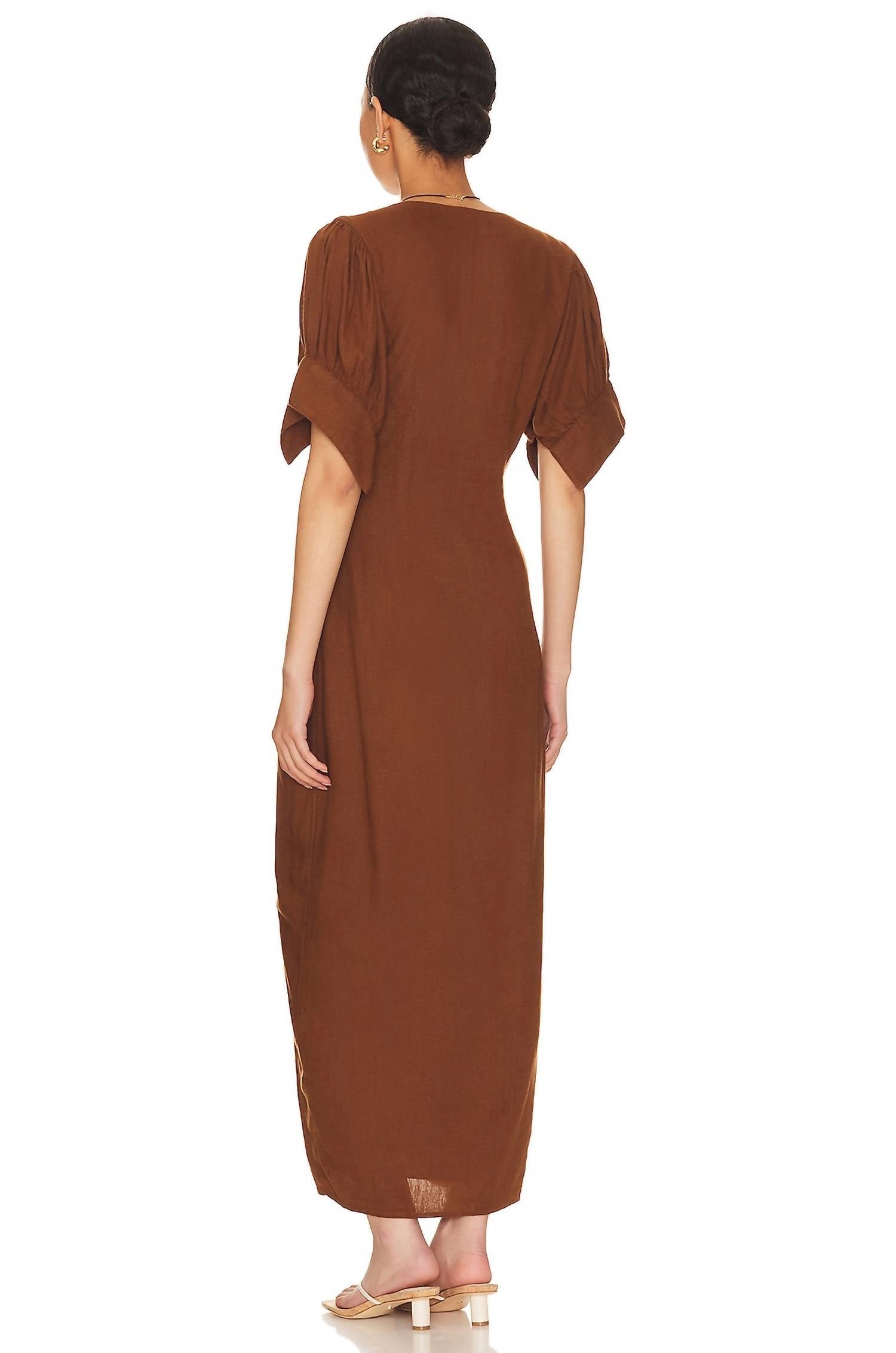 Timeless elegance crafted meticulously from a blend of 81% viscose and 19% linen. Ensures both comfort and breathability. Rich chocolate hue lends a sense of sophistication and easy versatility. Empire waist silhouette and flattering V-neckline. Exudes a chic, effortless style that enhances your natural figure. Puff sleeves add a dash of romantic charm. Front button closure with a tie detail offers a customized fit. Fully lined for your comfort. Promises a flawless finish and ultimate movability. Hand wash to preserve its beauty. Proudly made in India.