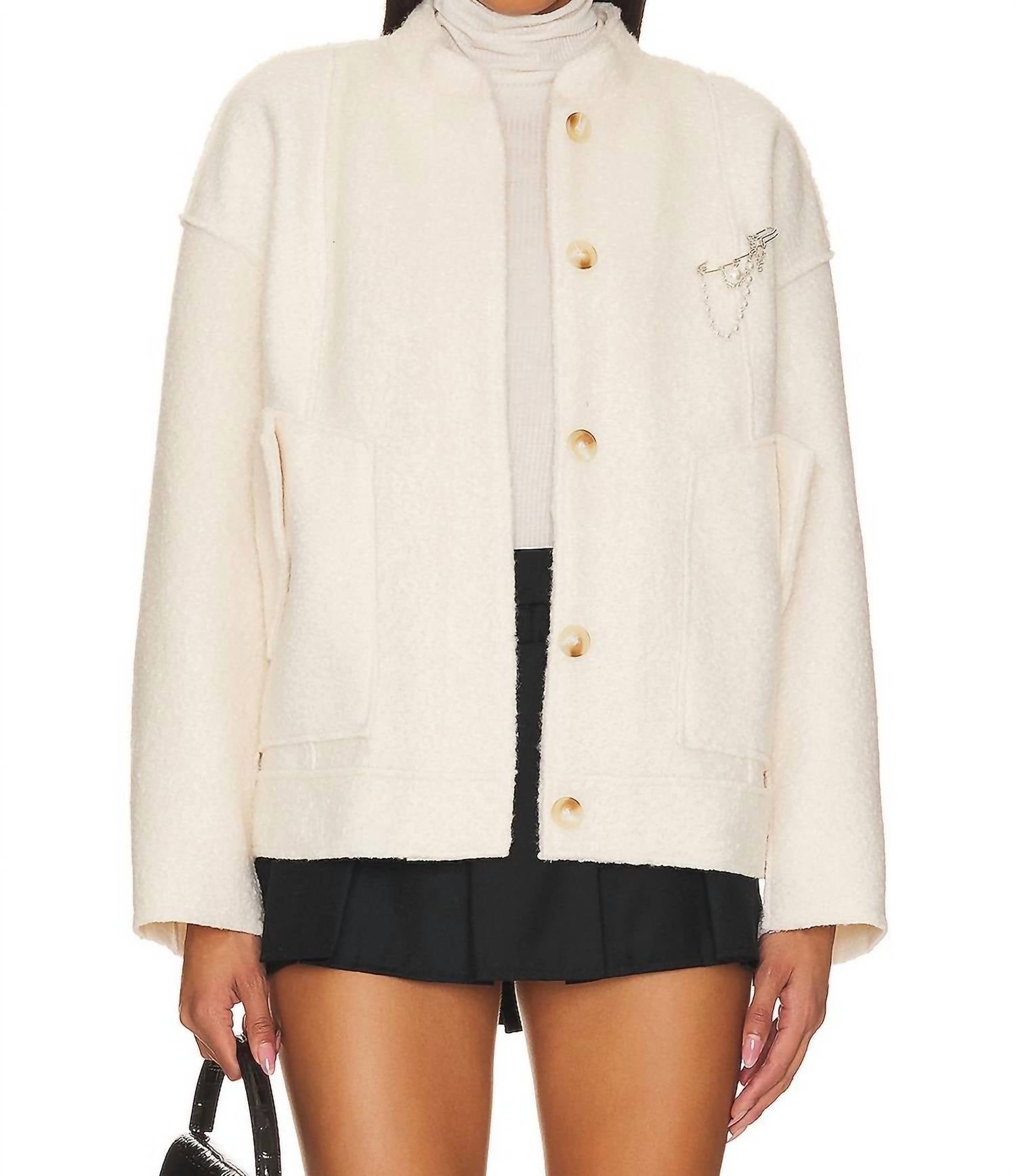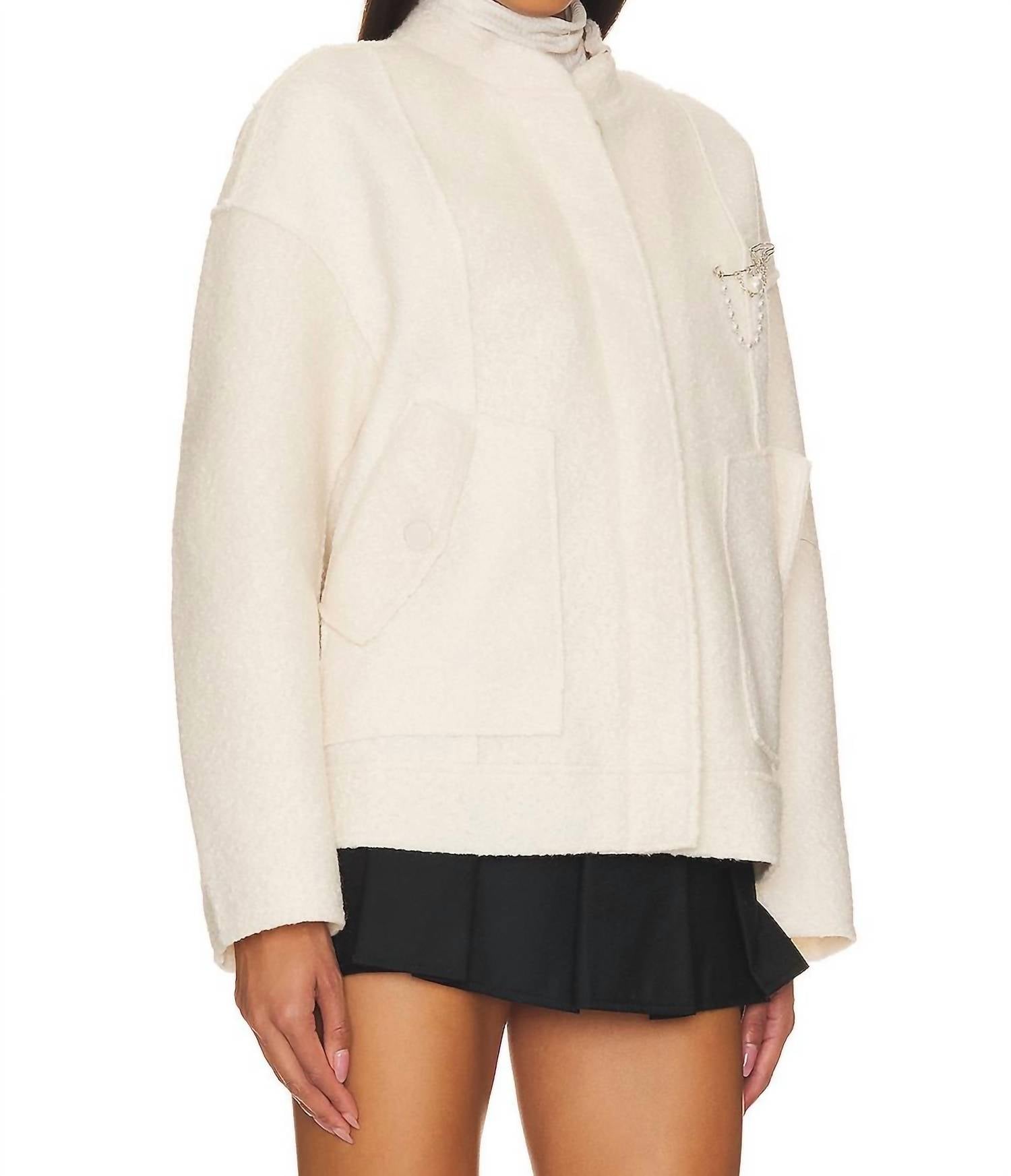 A riff on your favorite classic bomber jacket. Introducing the Willow Bomber Jacket by Free People, a chic addition to your winter wardrobe in elegant ivory. Crafted from 100% polyester, this jacket features long sleeves and a classic collar for a timeless look. Made in China, it includes slanted side pockets and a front button closure, accented with an oversized brooch pin with dangling pearl accents for a touch of sophistication. Care for this stylish piece by dry cleaning only.