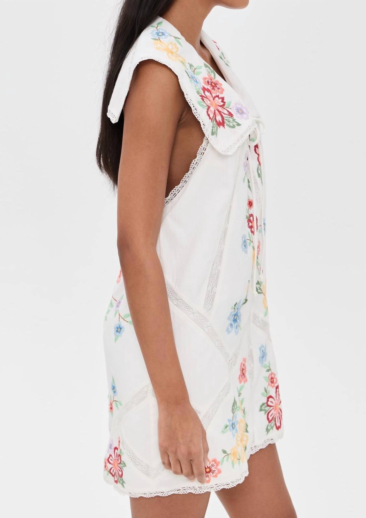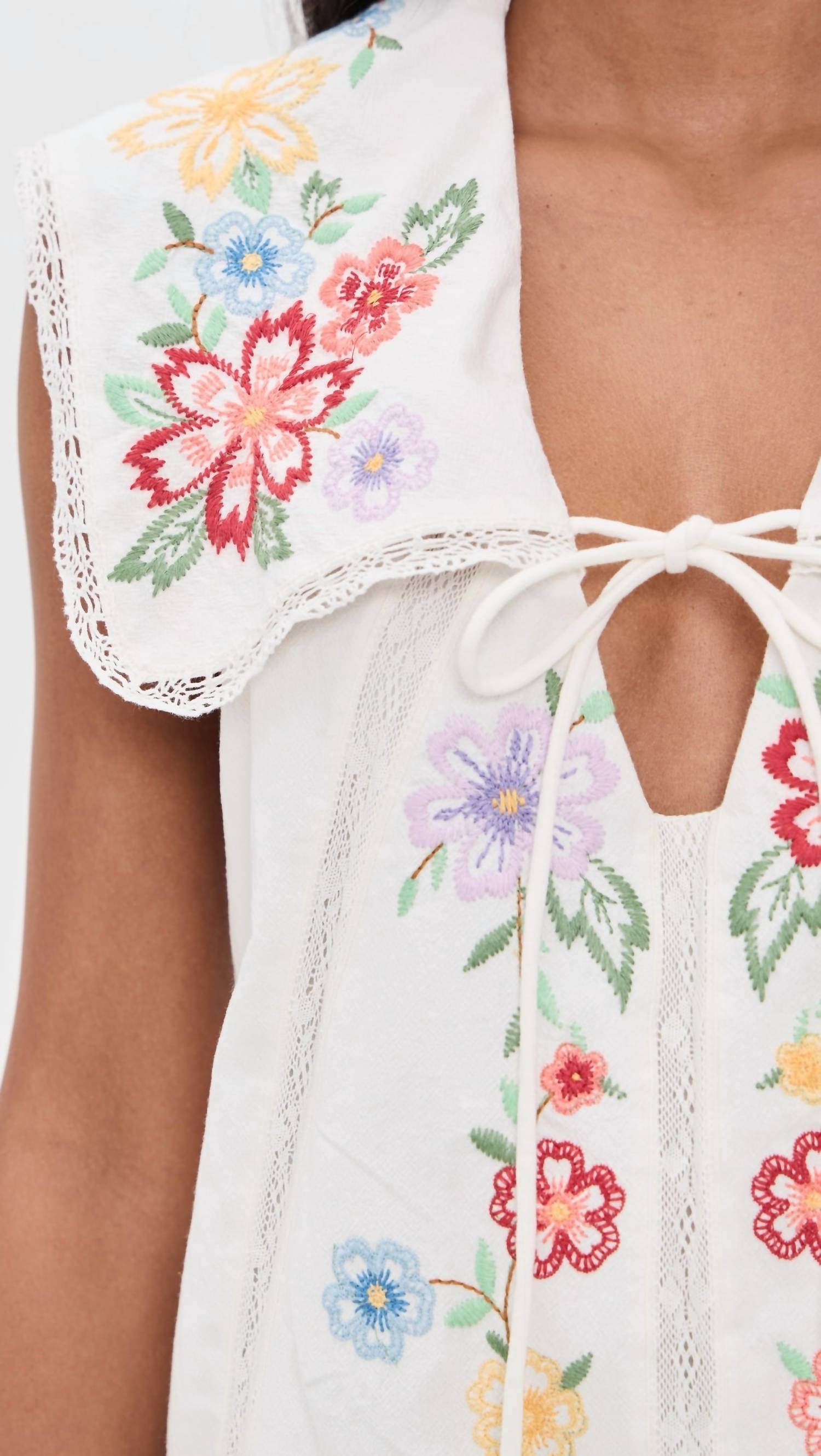 A short and breezy dress for those warmer days. The Willow Embroidered Mini Dress by Free People offers a sleeveless A-line style that's ideal for summer. Made from 100% cotton with a rayon lining, this dress features colorful and defined embroidery with a feminine touch. Crafted in India, it boasts an exaggerated collar, lace trim throughout, and a tie detail at the bust, all complemented by a V-neckline. Closure is a convenient pull-on style, and it measures 32 inches in length. Care is simple with hand wash instructions.