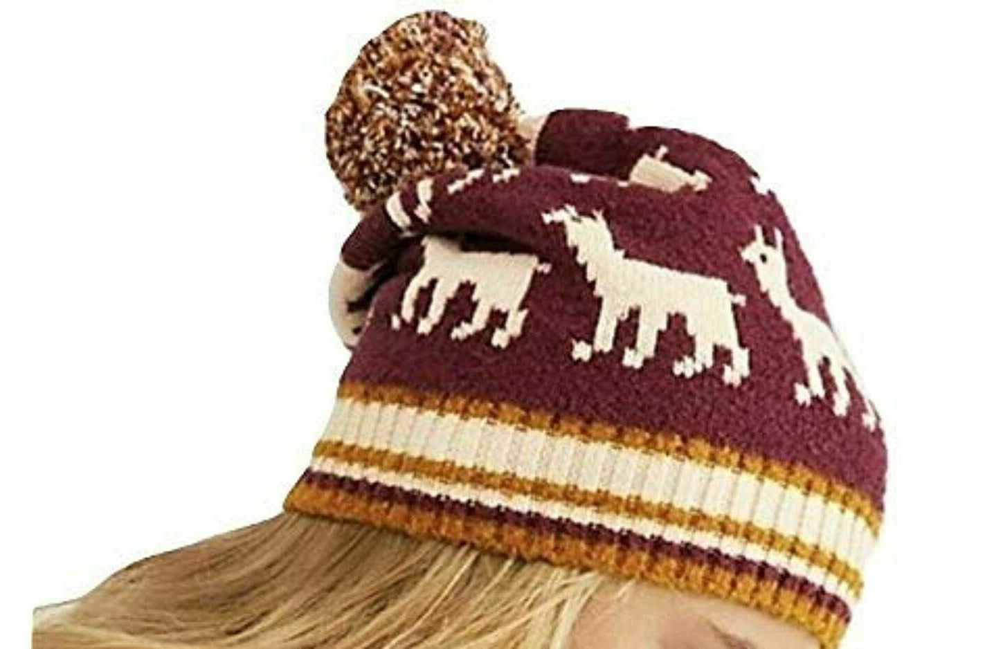 This fuzzy beanie featuring a colorful pom and playful alpaca pattern is definitely one you'll pack for your next ski trip.|48% cotton, 27% nylon, 25% acrylic|Hand wash, dry flat