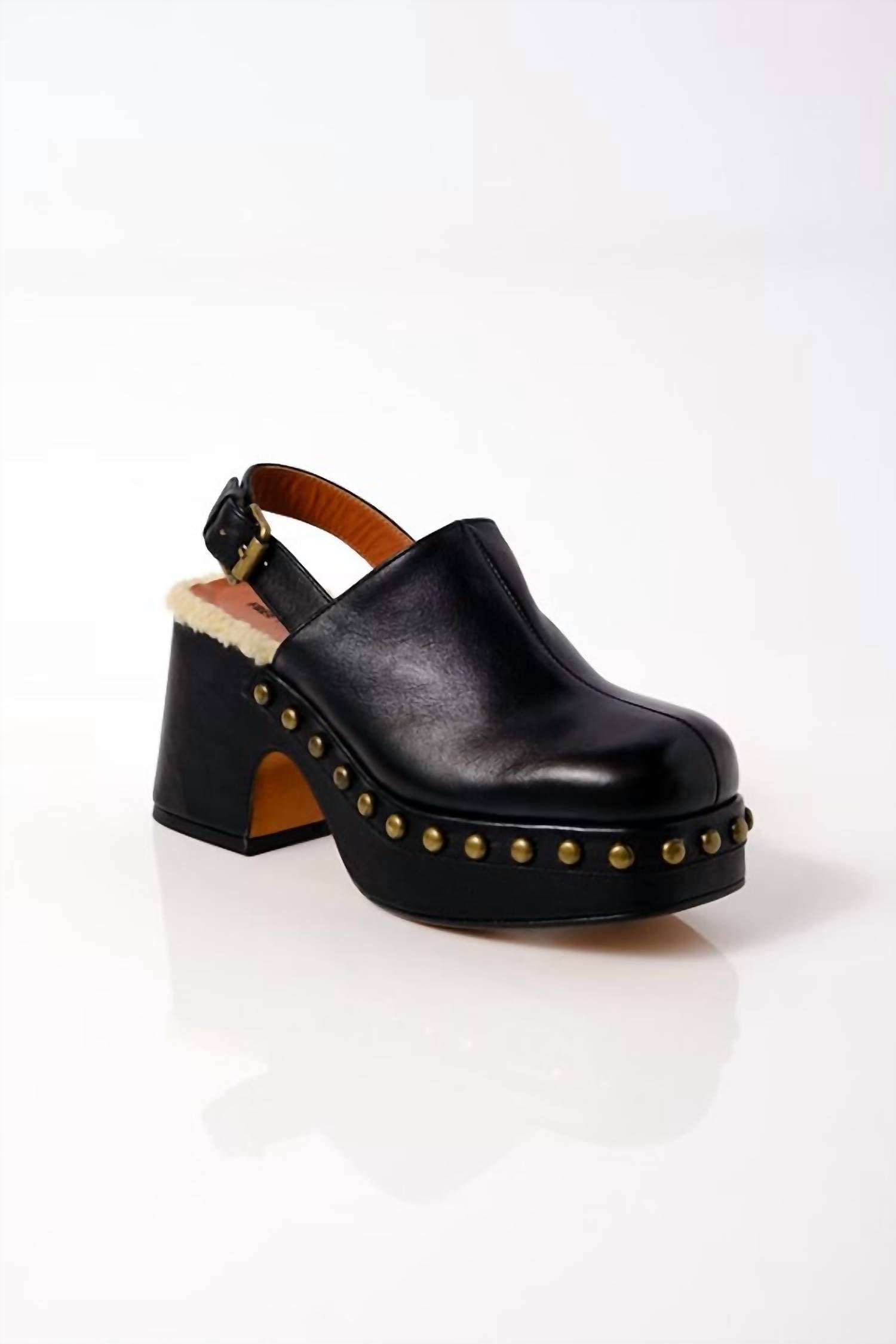 Stylish, comfy, and versatile. We can't find anything wrong with these. Step into a free-spirited yet edgy style with the Women's Autumn Studded Platform Clogs by Free People, a standout in black. Crafted from fine leather, these clogs feature a slip-on design with an adjustable buckle slingback strap, complemented by a faux sherpa-lined footbed for all-day comfort. The high 3.5" chunky block heel and mega platform sole create a statement silhouette, while stud accents add a touch of vintage charm. Made in Italy, these clogs pair beautifully with flared jeans for a groovy look.