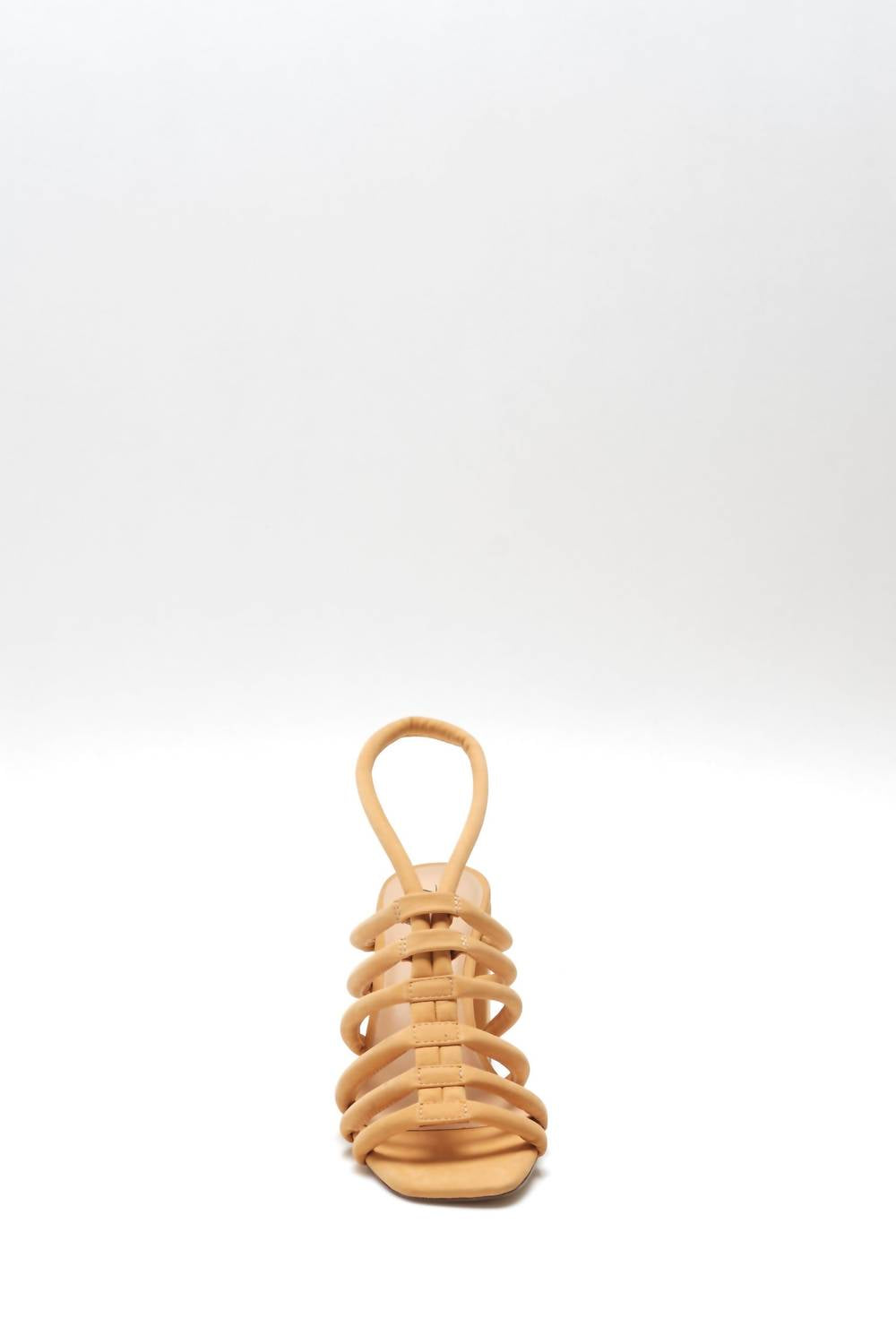 Slip-on style and buttery soft leather with chunky round straps, a square-toe footbed, and bold pyramid-style block heel. Heel: 3.5 in.
