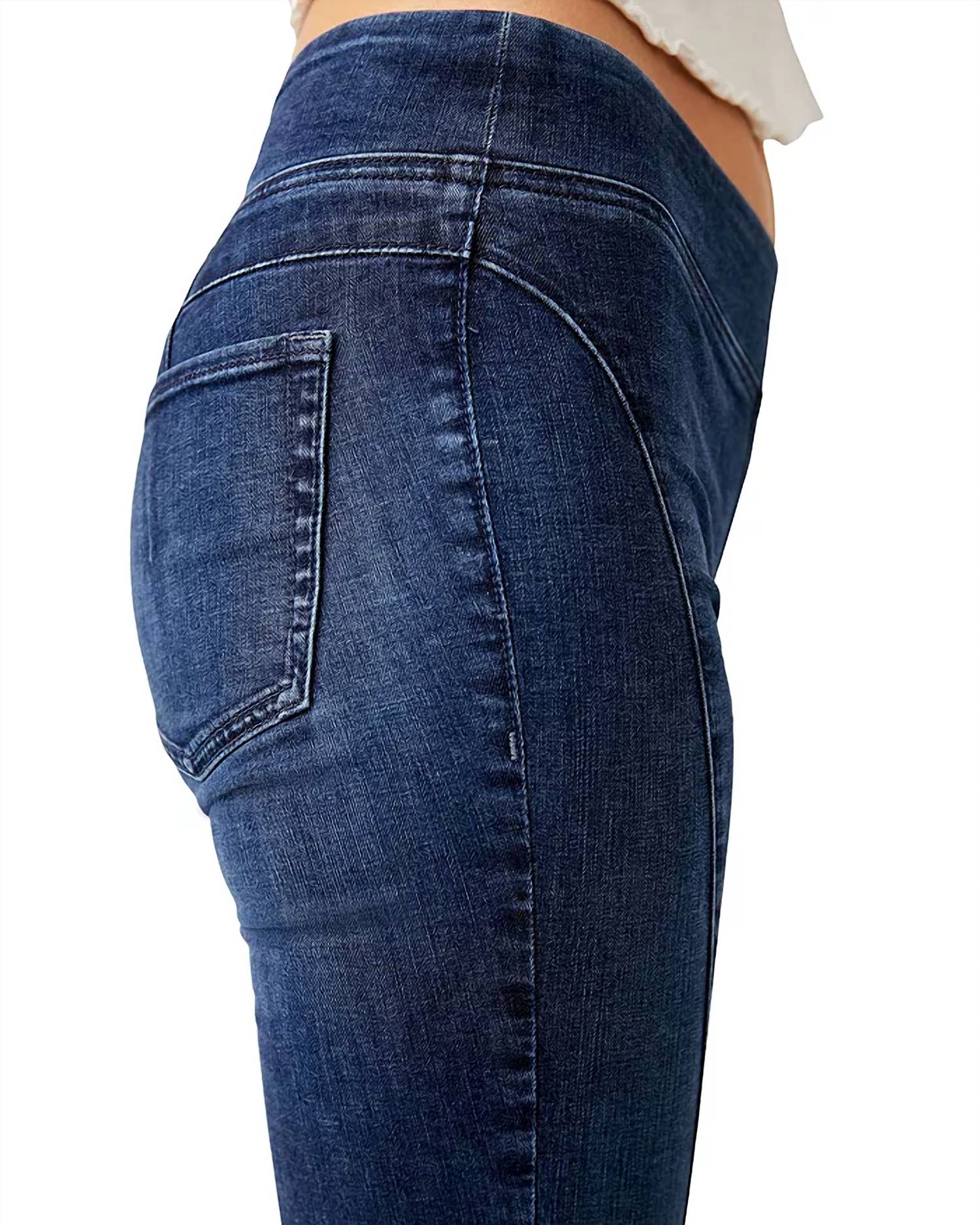 These pants feature a fitted silhouette and mid-rise, stretch fit. It includes a pull-on style, back pockets, wide waistband, raised seam detail, and skinny legs with slits at both hems. Waist: 30.5 in; Hips: 35 in; Rise: 9.87 in; Inseam: 32.5 in (size S). 85% Cotton, 13% Polyester, 2% Elastane. Machine wash cold. Imported.