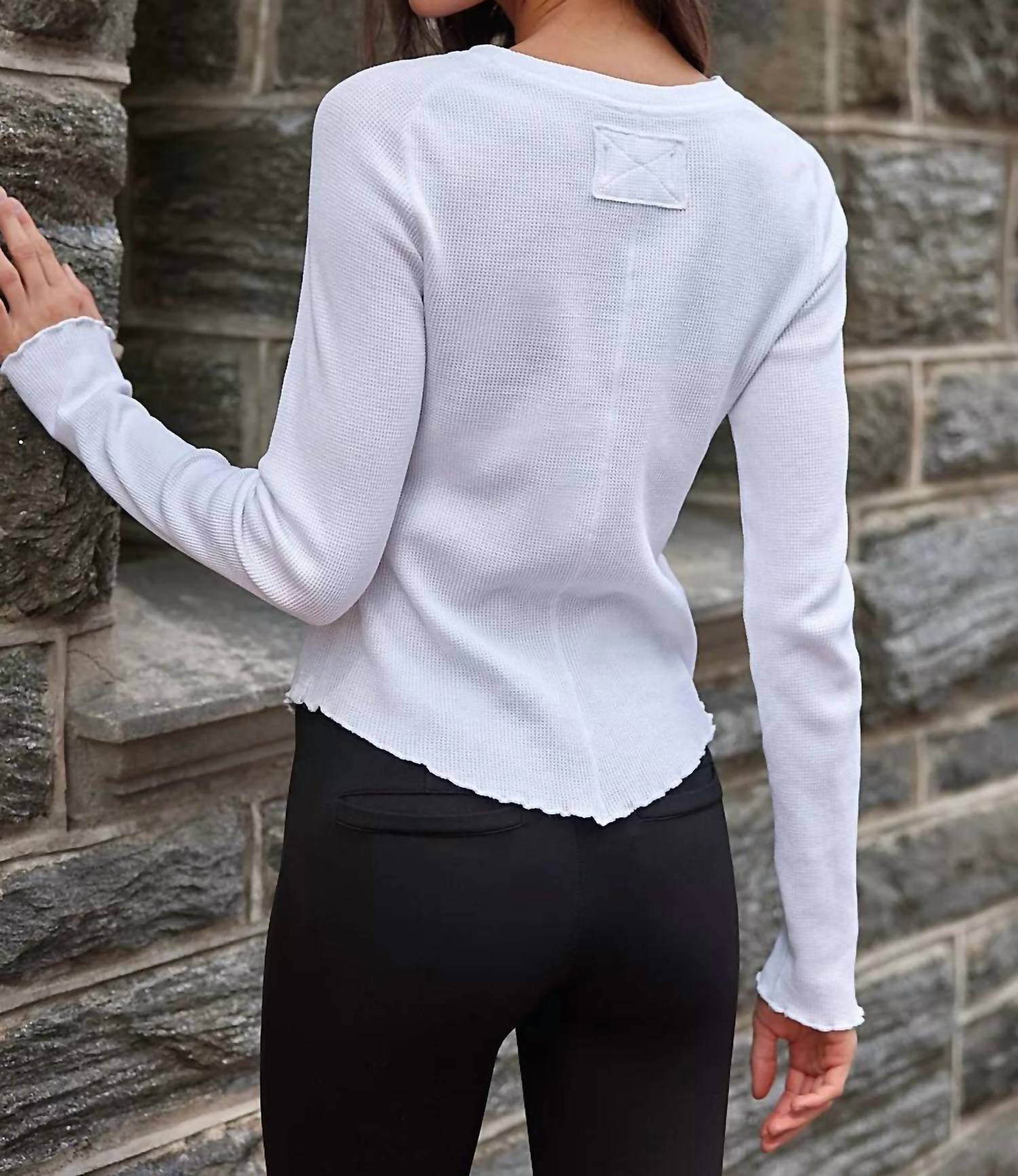 The perfect long sleeve tee that goes with just about anything. Introducing the Women's Easy Does It Top by Free People, a timeless piece from the We the Free collection. This white long-sleeve tee boasts a comfortable waffle-knit texture with raglan-cut sleeves and charming lettuce-edge trim. Made from a breathable blend of 95% Cotton and 5% Spandex, it features a crew neckline and a hip-length, relaxed fit, perfect for versatile styling. Care: Machine wash cold.