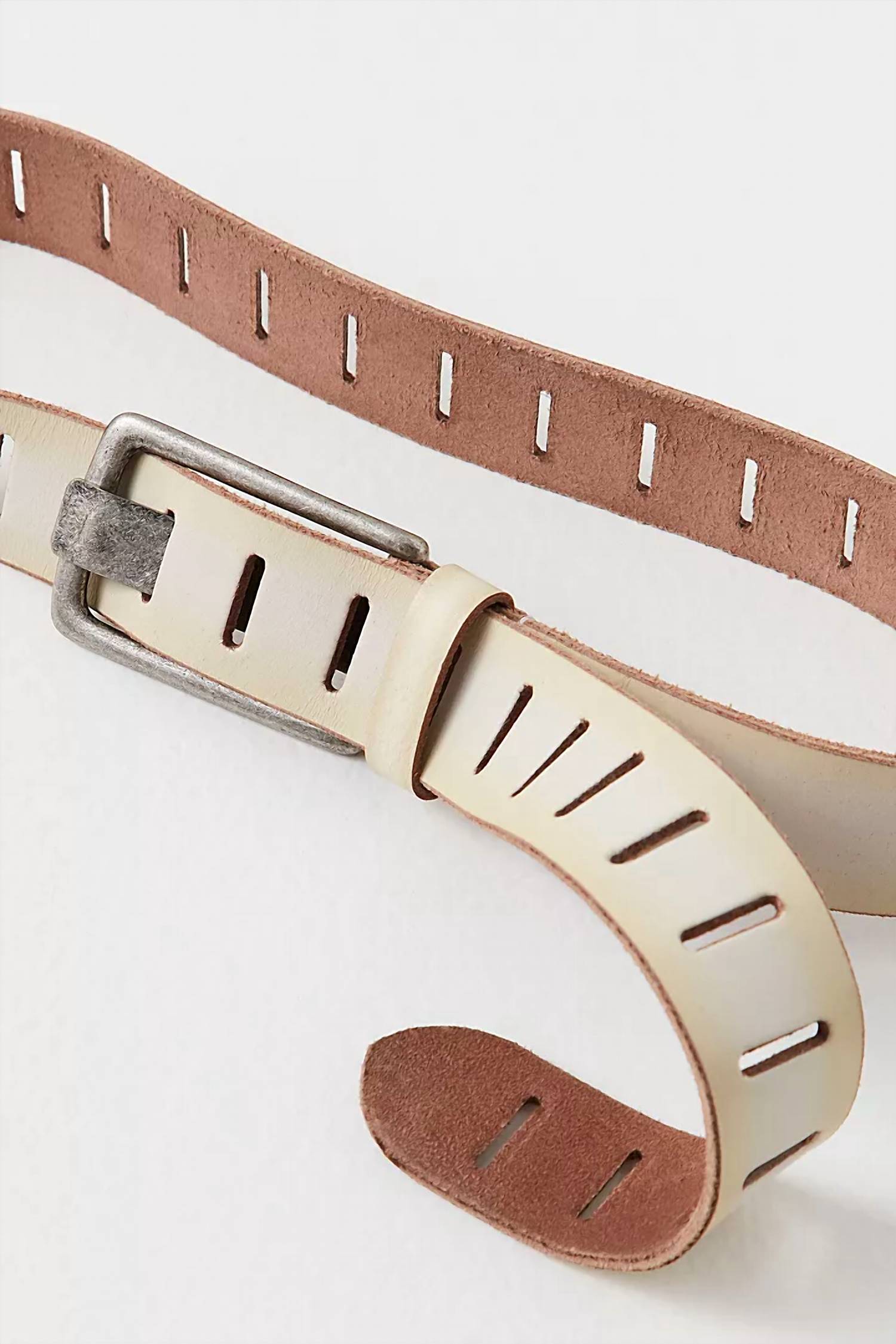 Essential leather design. Ivory belt features a medium width and adjustable rectangle buckle closure. Ensuring a perfect fit. Thin slot detailing adds a touch of cool sophistication. Ideal for wearing visibly or subtly. Elevates any ensemble with effortless style.
