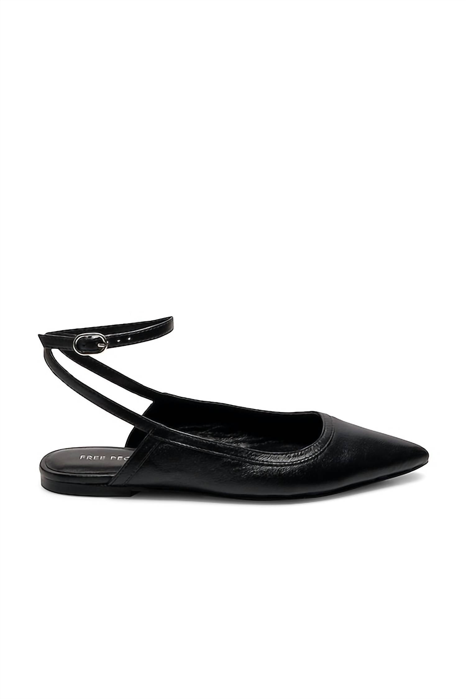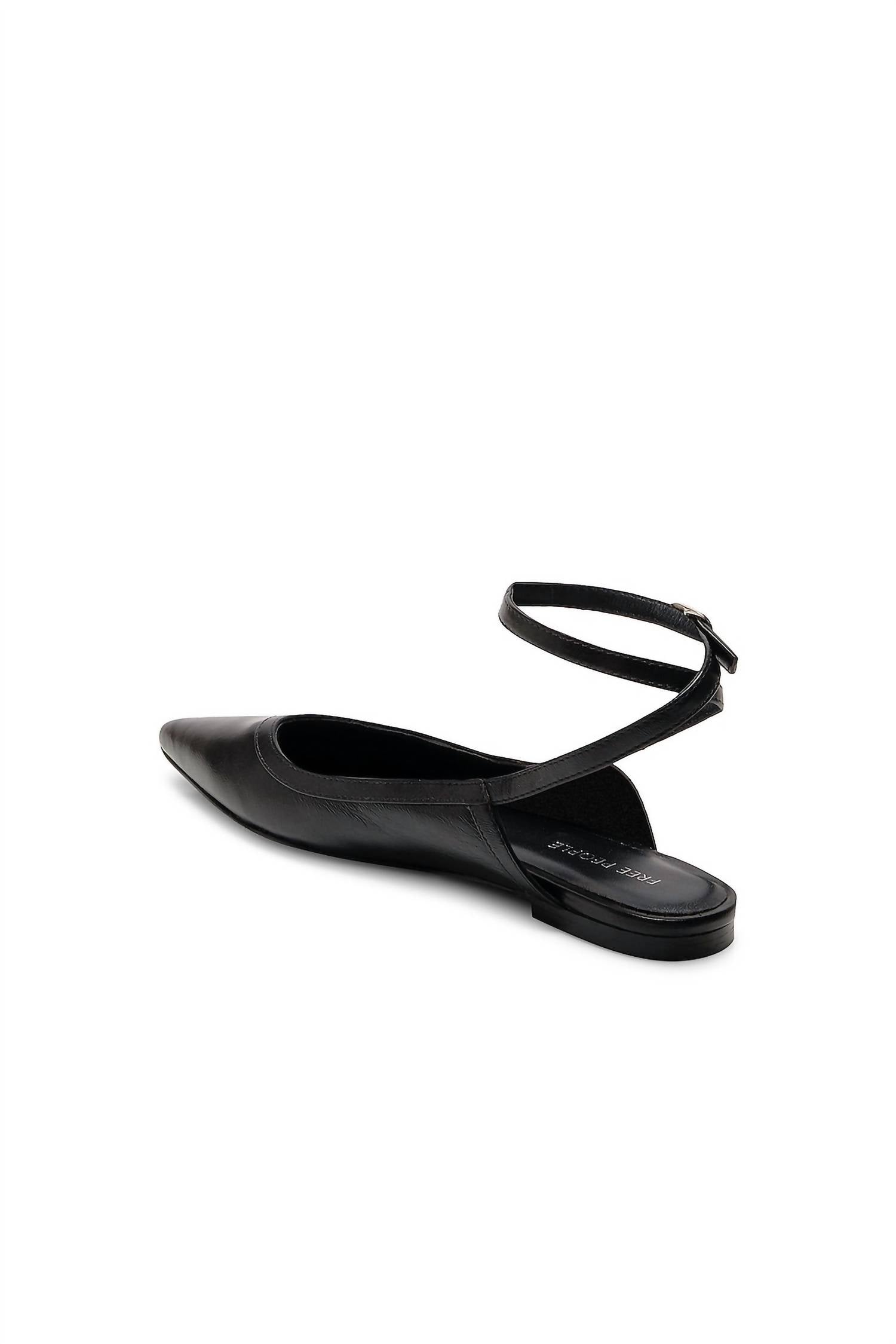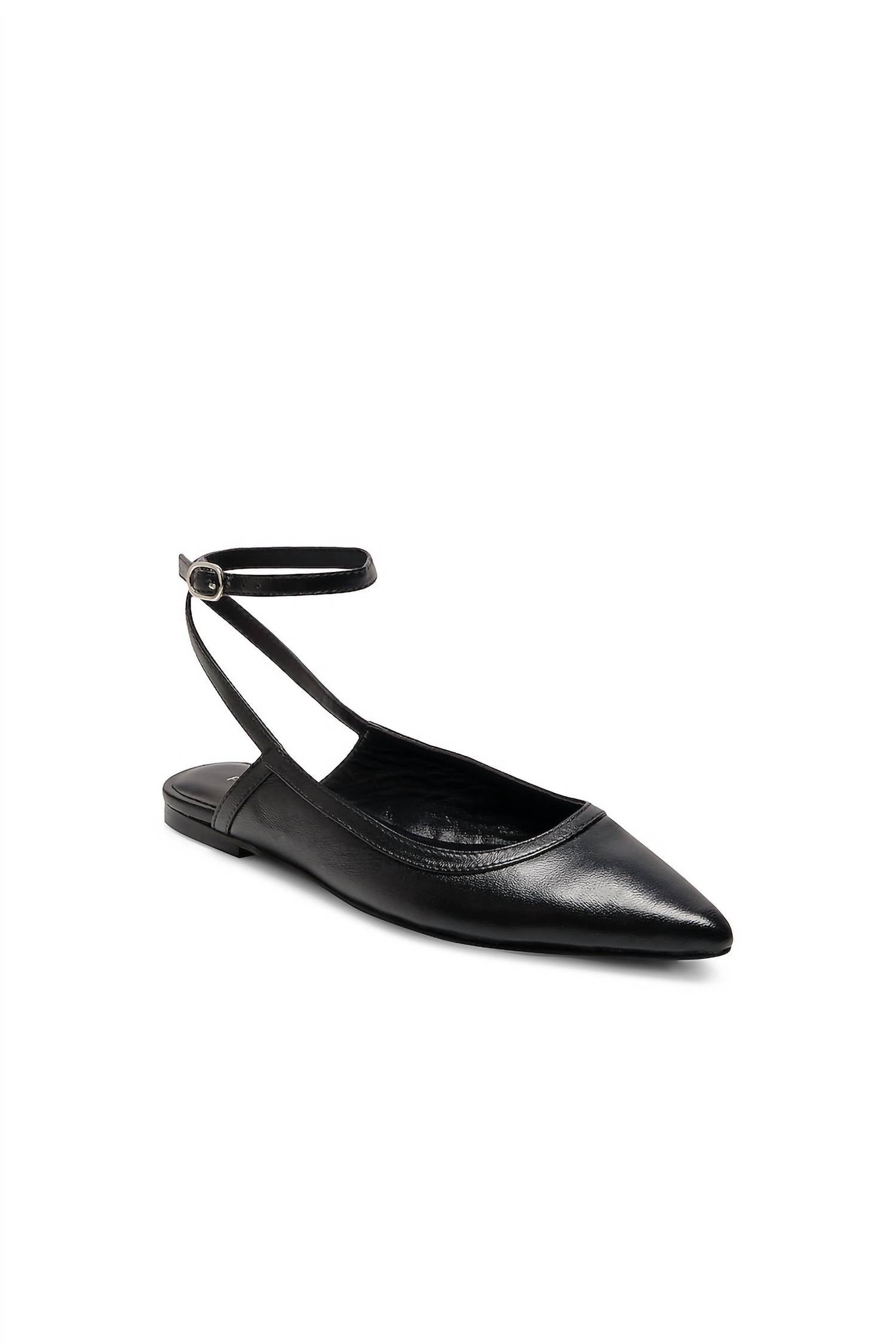 These flats feature soft leather uppers and a sharp pointed toe, complete with a wrap adjustable buckle ankle strap, a backless design, and a flat sole.