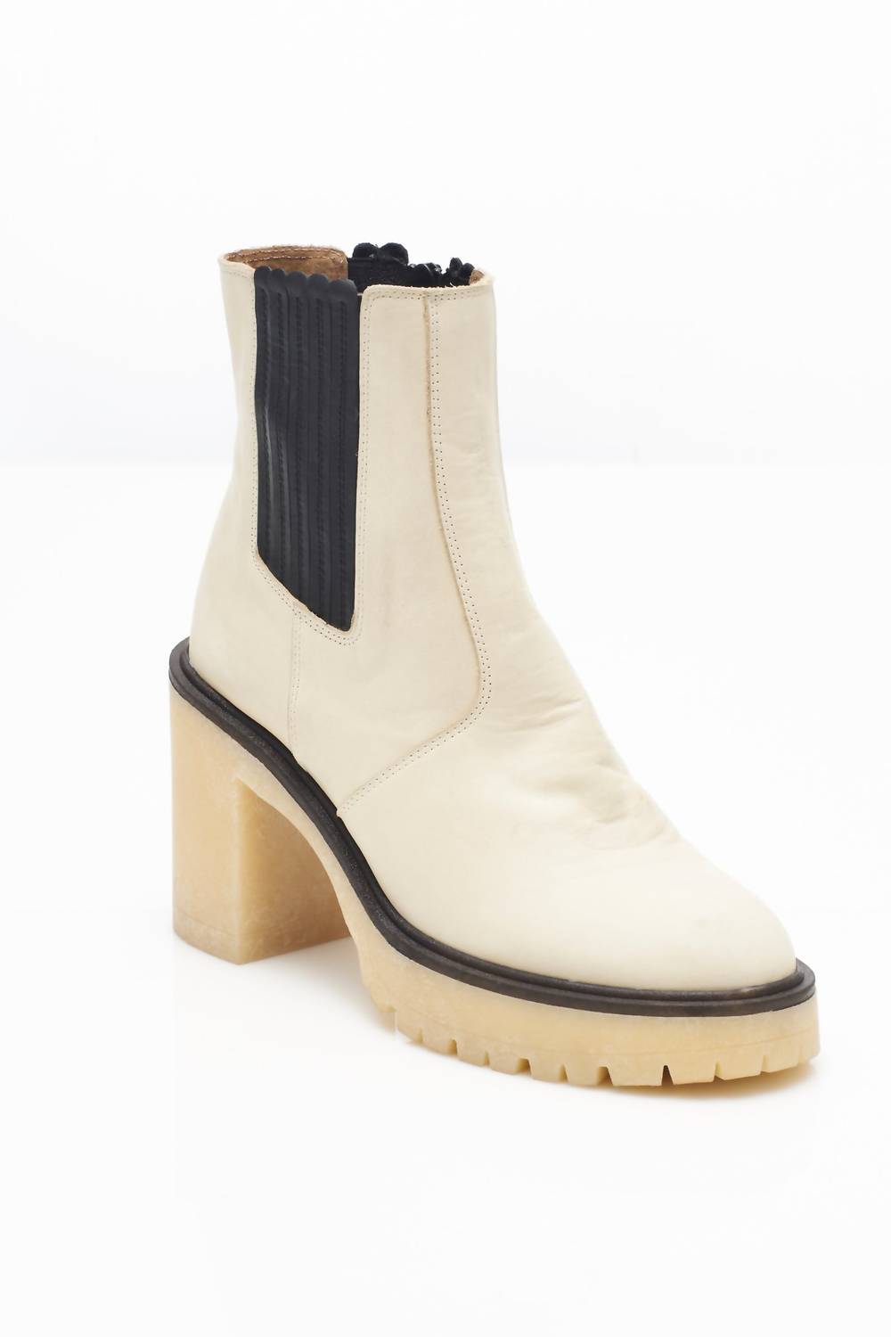 Featured in a chunky heeled design with elastic side details and a slim silhouette. These boots feature intentionally distressed detailing for a worn-in look. Side zipper closure. Cushioned insole. Almond toe. Runs true to size, if in between sizes; we suggest sizing up. Measurements for size 39. Ankle Circumference: 10.04 in; Shaft: 4.72 in; Top Circumference: 10.04 in; Heel: 3.66 in. Made in Spain.
