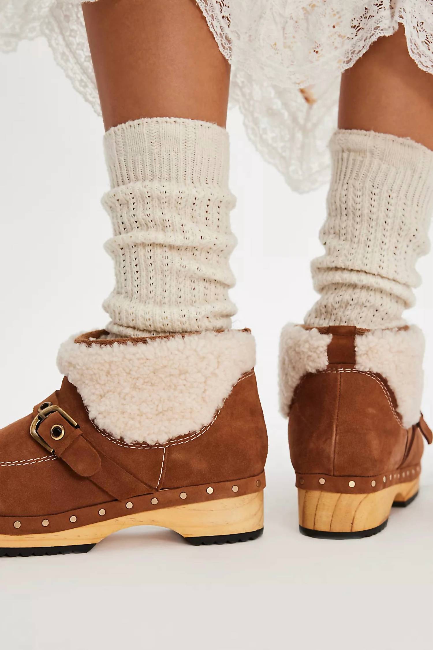 Say hello to the perfect, most versatile boot. The ankle height makes this style easily transition from day to night. Wear them with your favorite skinny jeans and tee for a more laid back look, or pair them with your favorite mini dress and jacket for a night out on the town. Experience the perfect blend of cozy and classic with the Women's Oak Clog Boot by Free People. These low-ankle length clog-inspired booties feature a luxurious suede upper paired with fuzzy sherpa panels and lining, offering a chic warmth. Set on a striking 1 1/2" platform wood sole, these boots are finished with buckle detailing and polished studs that accentuate the wood-grain design. Crafted for comfort and durability, they include a cushioned footbed and a rubber outsole, making them ideal for any stylish outing. Length: 5" shaft. Closure: Pull-on style. Composition: Leather and polyester faux-shearling upper and lining. Origin: Imported.