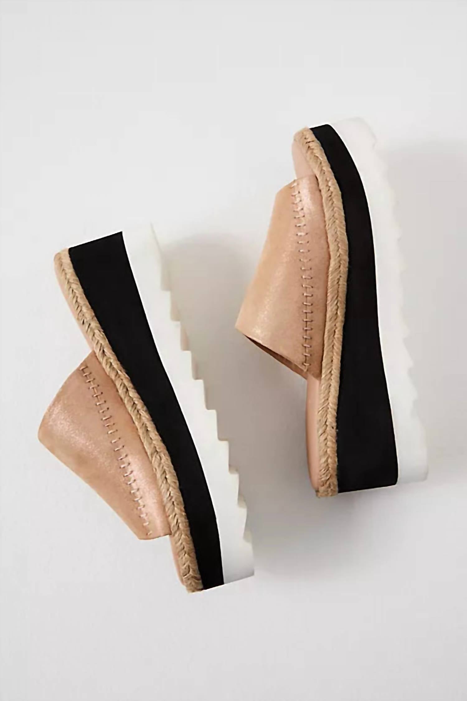 Featured in an espadrille style and platform silhouette. Soft leather upper, lined footbed, wide band, contrast stitching, round toe, classic slip-on style, durable treaded outsole.