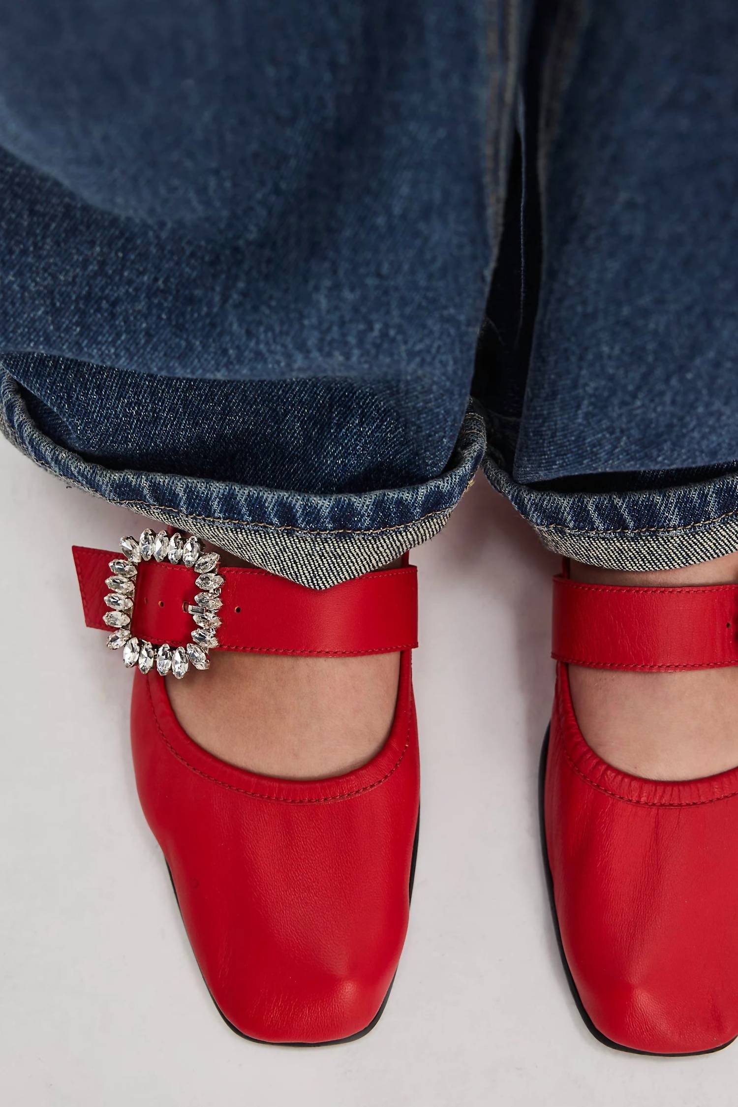 A classic loafer that is both comfortable and polished. Elevate your style featuring leather uppers in a striking red hue. Artisanal ballet flats have a slip-on style with an adjustable vamp strap and a sparkling rhinestone buckle. Offering a blend of fashion and comfort. Squared toe design and flat sole. Crafted from premium leather and rubber. Embody the signature vintage aesthetic Free People is renowned for.
