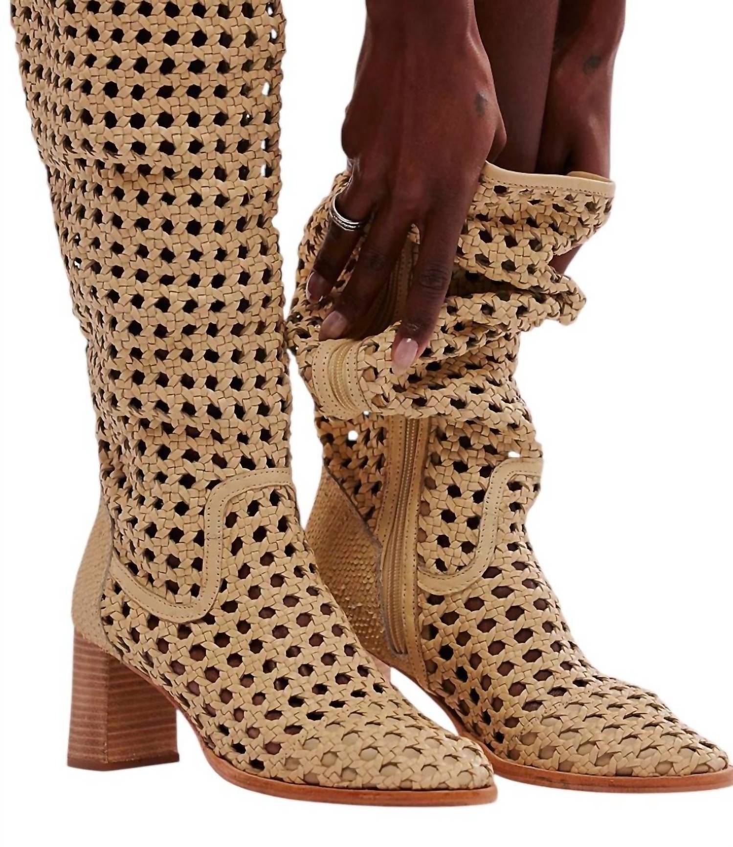 The knee-high boots feature woven, rattan-inspired uppers, a slouchy design, and a chunky block heel. They have unlined leather woven uppers, an almond toe, and an inner leg zipper. Heel height: 2.95 in, Shaft height: 10.04 in.