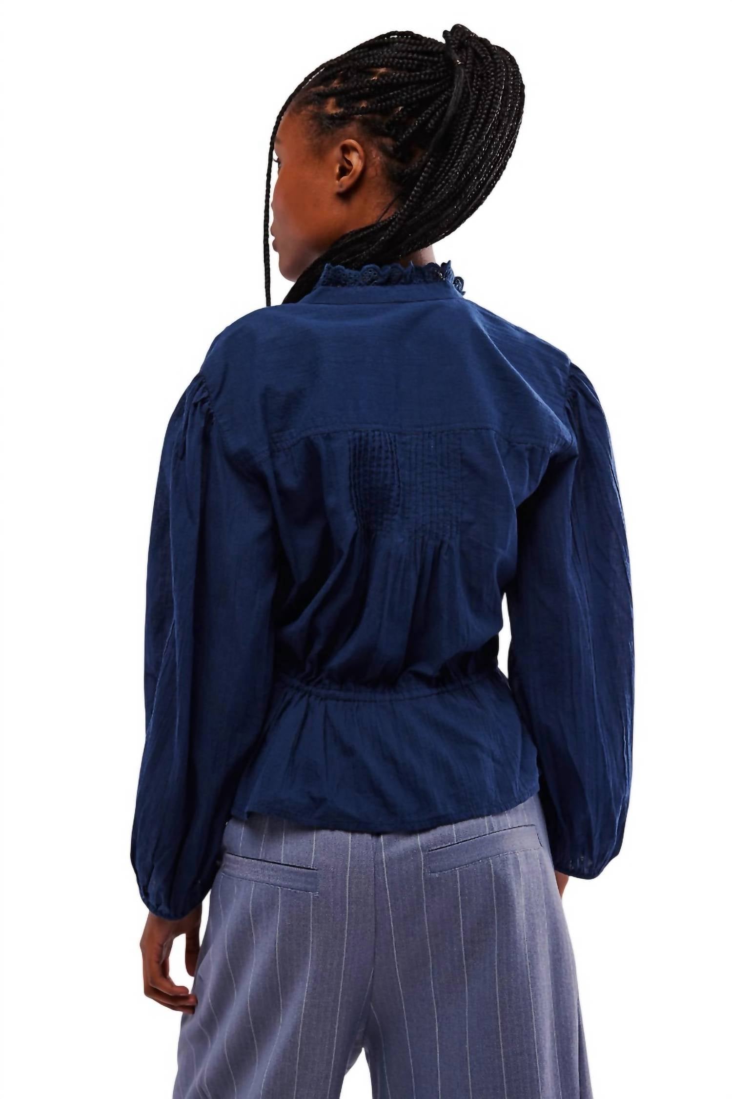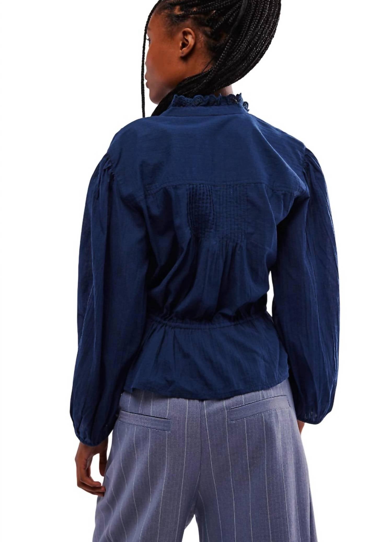 Pair this with your favorite jeans and slides for your next girls night out. Relaxed fit, hip-length style. Soft cotton fabrication, round-neckline, puffy long-sleeves with elasticated cuffs, button-front closures, cinched waist detail with functional tie, pleated back for added dimension. Machine Wash Cold. Import. Bust: 42 in. Length: 23 in.
