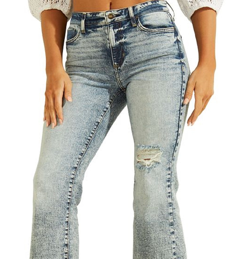 Add a little flair to your denim collection with these GUESS high-rise jeans. A laid-back kick flare silhouette with throwback vibes| perfect for sunny days ahead. | Approx. inseam; 25| High rise; approx. 10| Zipper and button closure; belt loops| Raw hem