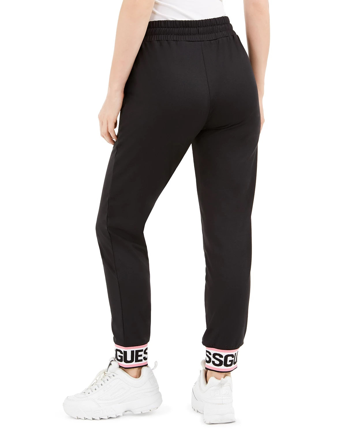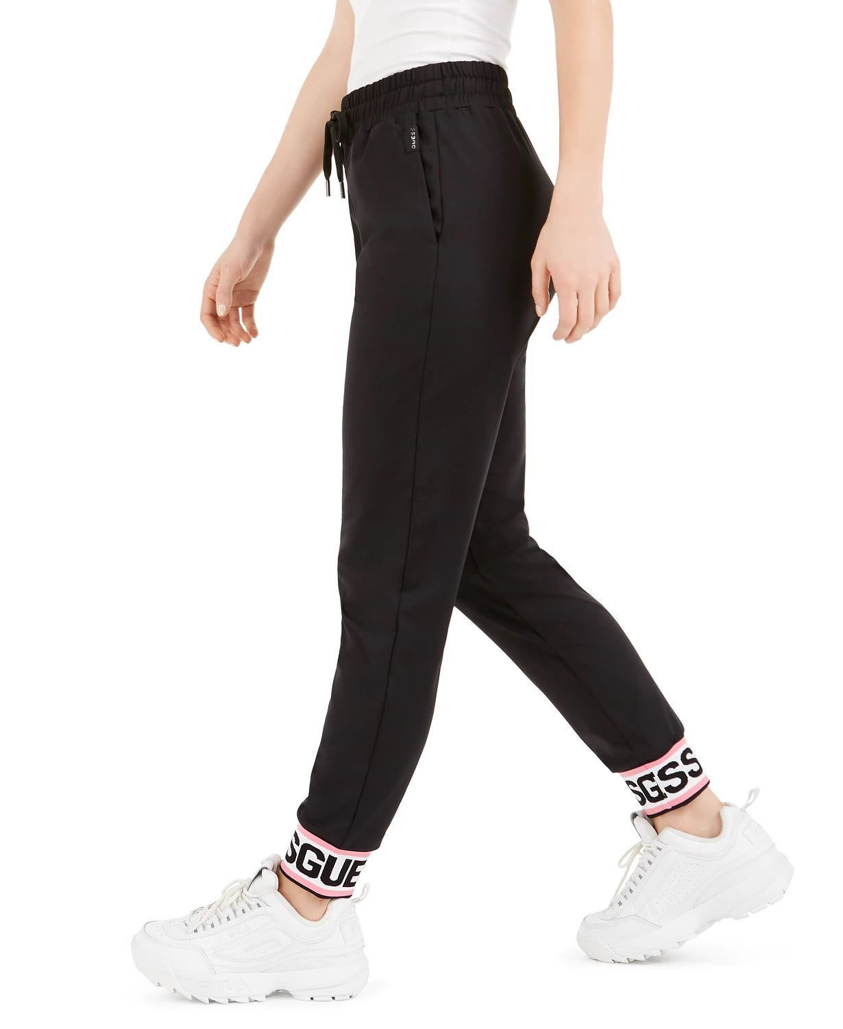 Approx. inseam: 25"|High rise|Pull-on style; elastic waistband with drawstring detail|Banded contrast hem with "GUESS" graphic|Shell: polyester/spandex/elastane; rib: polyester/spandex/elastane|Machine washable|Imported